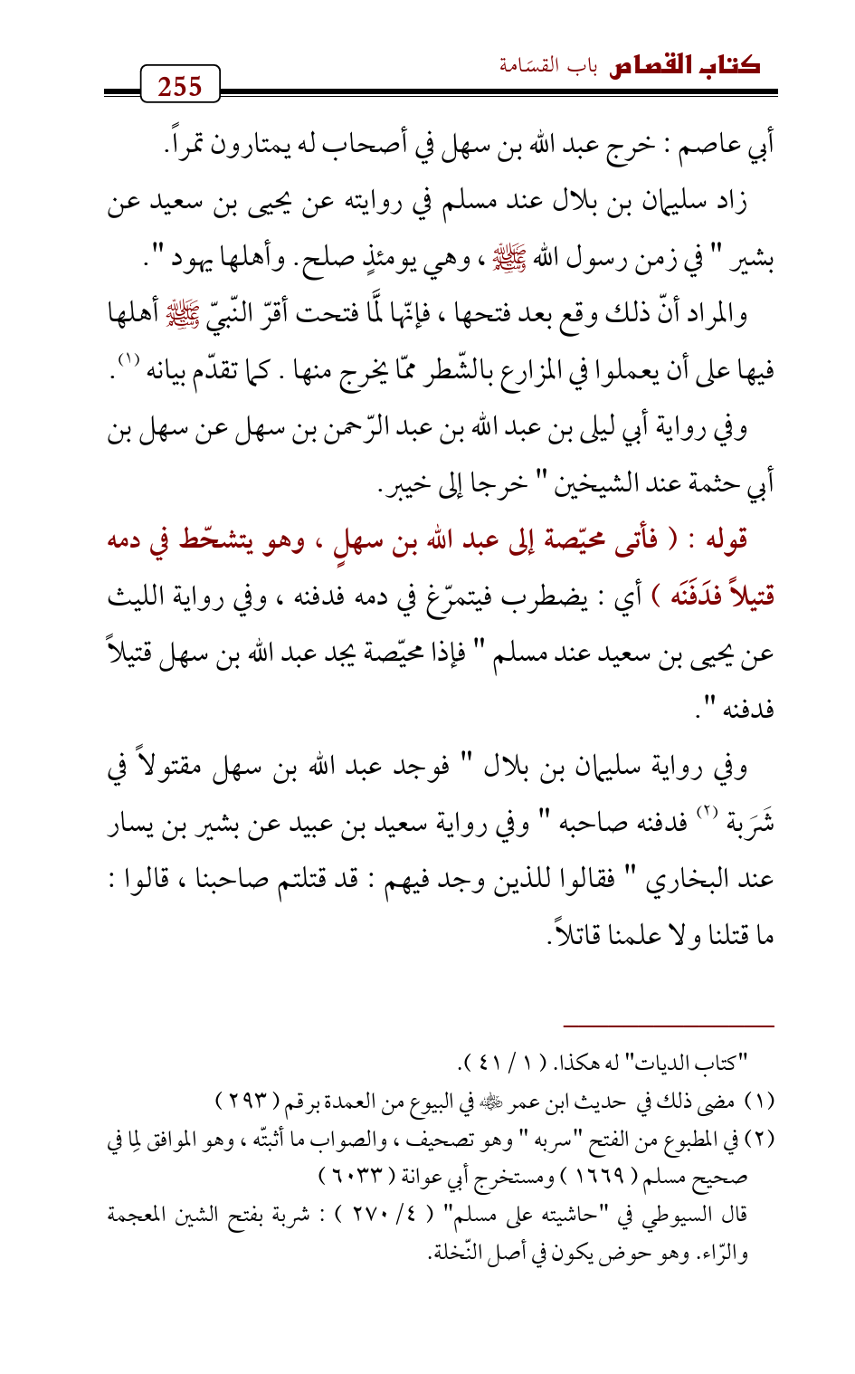 وفي رواية سليمان بن بلال " فوجد عبد الله بن سهل مقتولاً في شَرَبة (¬2) فدفنه صاحبه " وفي رواية سعيد بن عبيد عن بشير بن يسار عند البخاري " فقالوا للذين وجد فيهم: قد قتلتم صاحبنا، قالوا: ما قتلنا ولا علمنا قاتلاً.