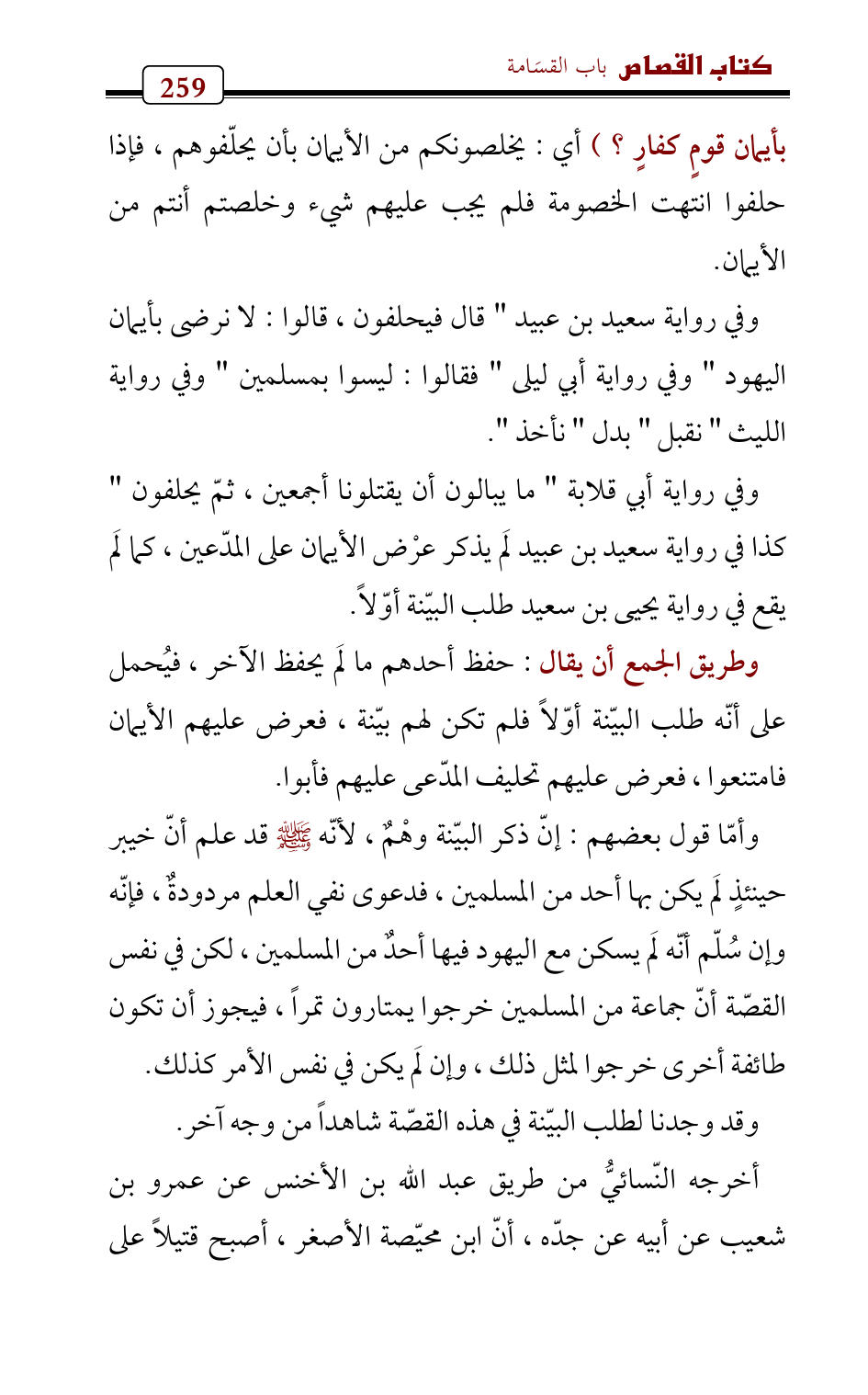 وفي رواية أبي قلابة " ما يبالون أن يقتلونا أجمعين , ثمّ يحلفون " كذا في رواية سعيد بن عبيد لَم يذكر عرْض الأيمان على المدّعين , كما لَم يقع في رواية يحيى بن سعيد طلب البيّنة أوّلاً.
