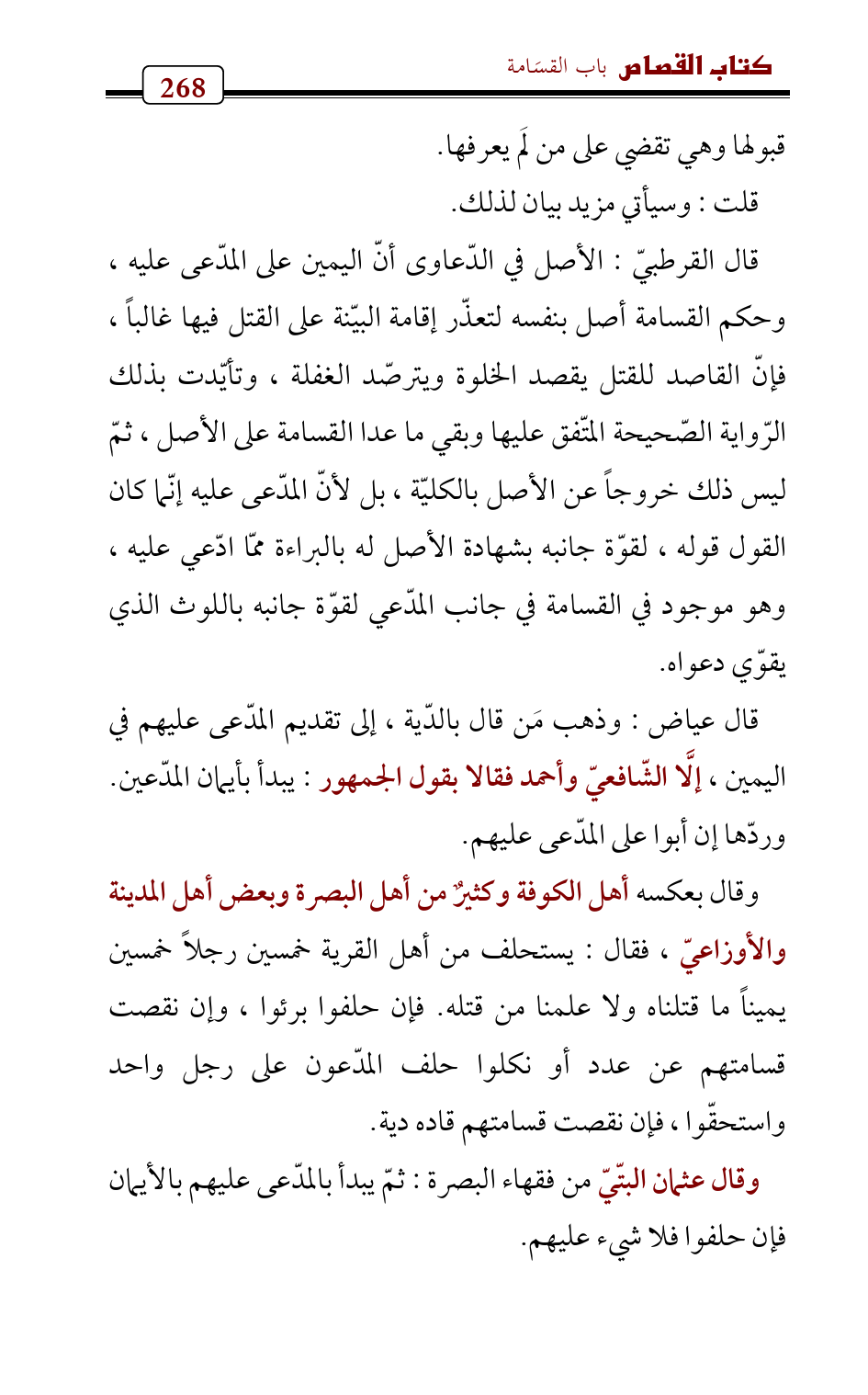 قال عياض: وذهب مَن قال بالدّية , إلى تقديم المدّعى عليهم في اليمين، إلَّا الشّافعيّ وأحمد فقالا بقول الجمهور: يبدأ بأيمان المدّعين. وردّها إن أبوا على المدّعى عليهم.