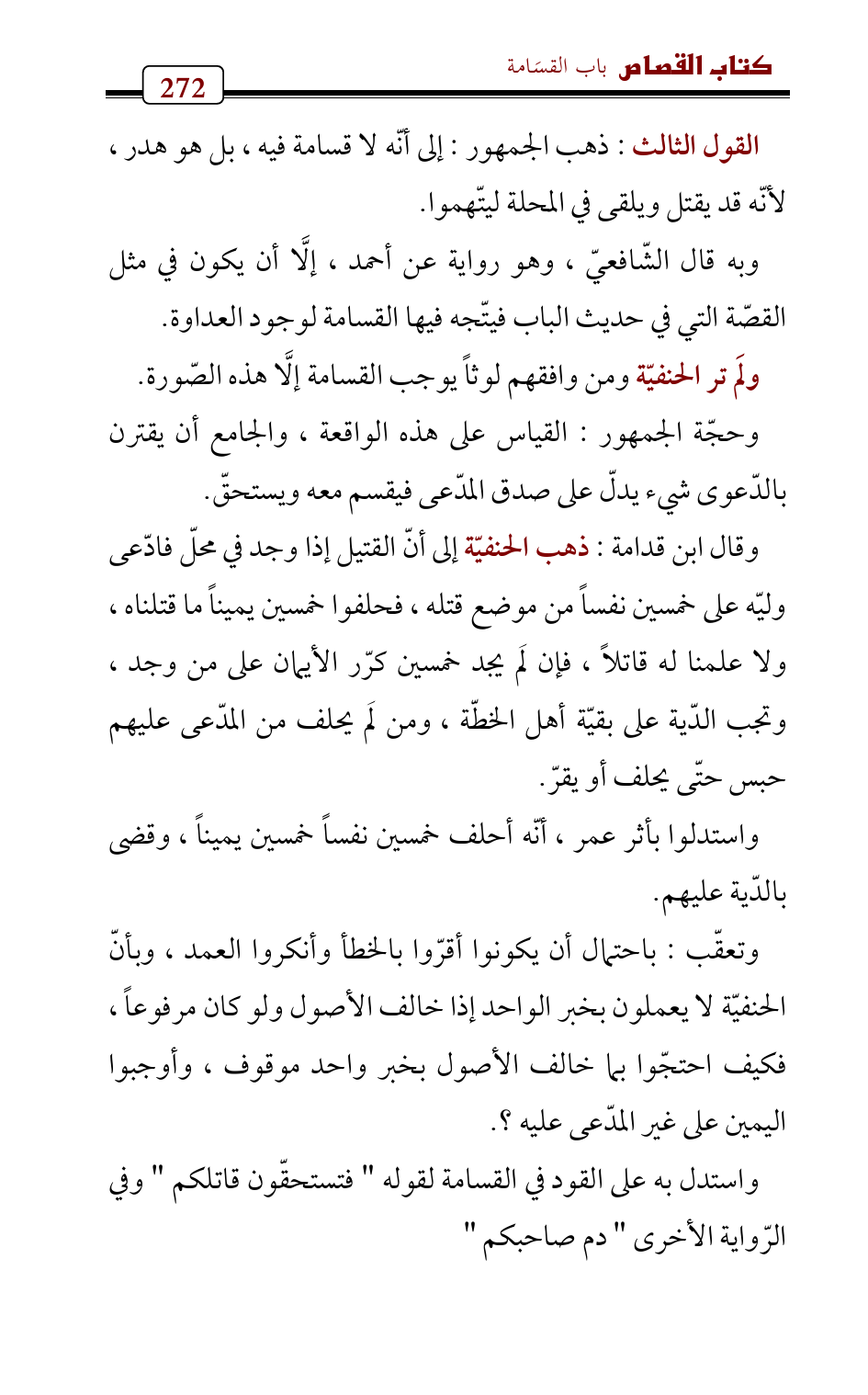 وقال ابن قدامة: ذهب الحنفيّة إلى أنّ القتيل إذا وجد في محلّ فادّعى وليّه على خمسين نفساً من موضع قتله , فحلفوا خمسين يميناً ما قتلناه , ولا علمنا له قاتلاً , فإن لَم يجد خمسين كرّر الأيمان على من وجد , وتجب الدّية على بقيّة أهل الخطّة، ومن لَم يحلف من المدّعى عليهم حبس حتّى يحلف أو يقرّ.