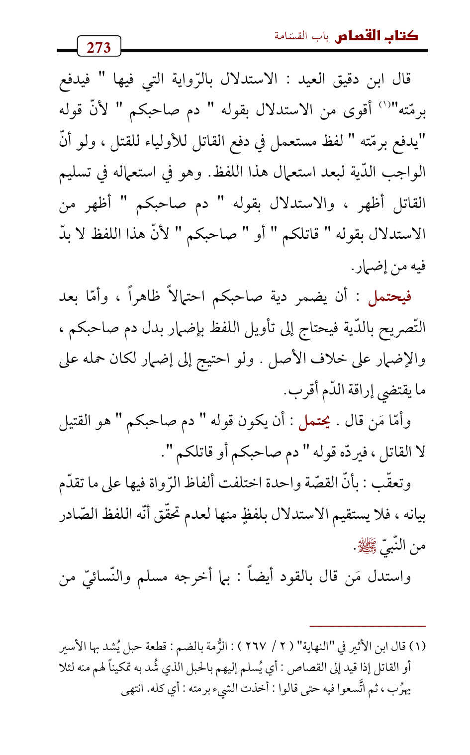 قال ابن دقيق العيد: الاستدلال بالرّواية التي فيها " فيدفع برمّته " (¬1) أقوى من الاستدلال بقوله " دم صاحبكم " لأنّ قوله " يدفع برمّته " لفظ مستعمل في دفع القاتل للأولياء للقتل، ولو أنّ الواجب الدّية لبعد استعمال هذا اللفظ. وهو في استعماله في تسليم القاتل أظهر، والاستدلال بقوله " دم صاحبكم " أظهر من الاستدلال بقوله " قاتلكم " أو " صاحبكم " لأنّ هذا اللفظ لا بدّ فيه من إضمار.