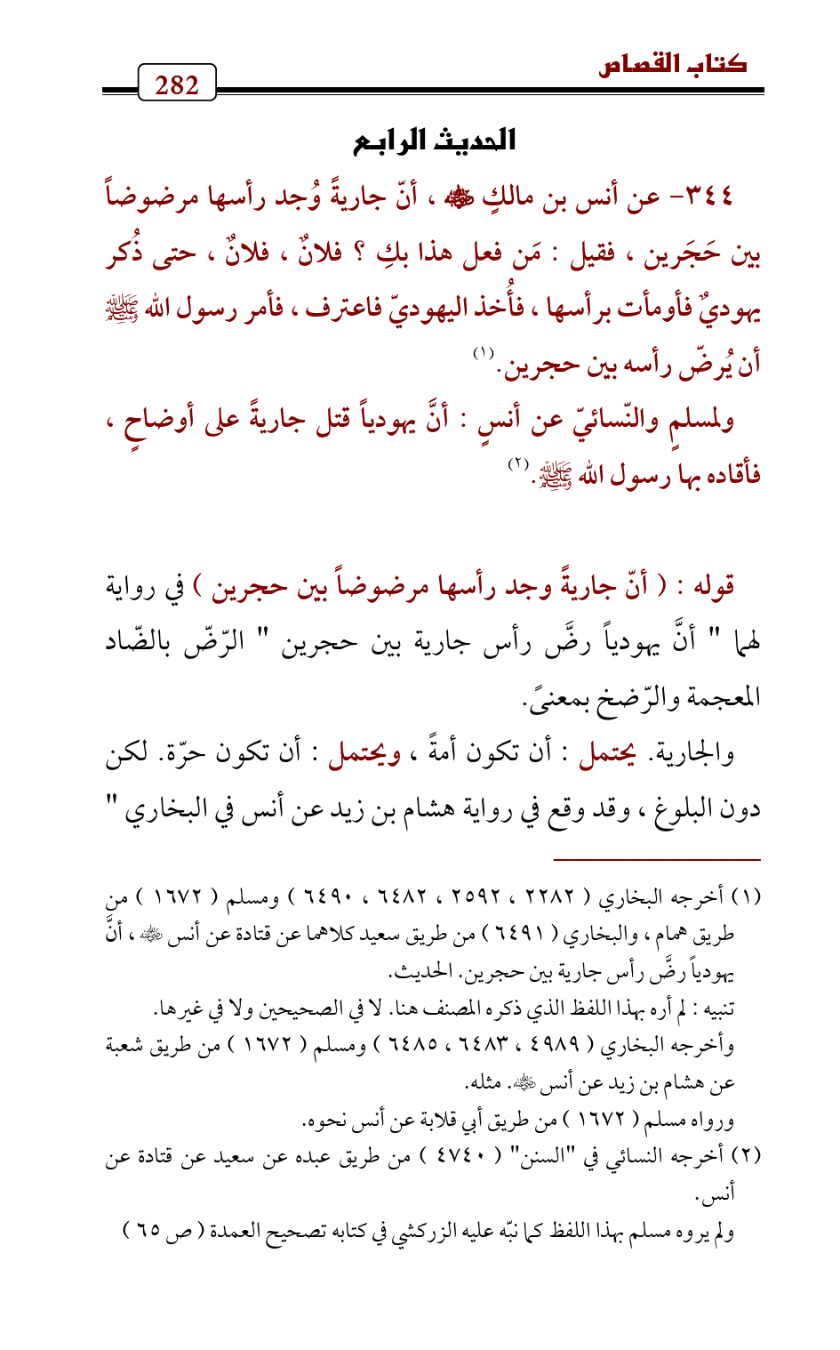 344 - عن أنس بن مالكٍ - رضي الله عنه - , أنّ جاريةً وُجد رأسها مرضوضاً بين حَجَرين، فقيل: مَن فعل هذا بكِ؟ فلانٌ، فلانٌ، حتى ذُكر يهوديٌ فأومأت برأسها، فأُخذ اليهوديّ فاعترف، فأمر رسول الله - صلى الله عليه وسلم - أن يُرضّ رأسه بين حجرين. (¬1)