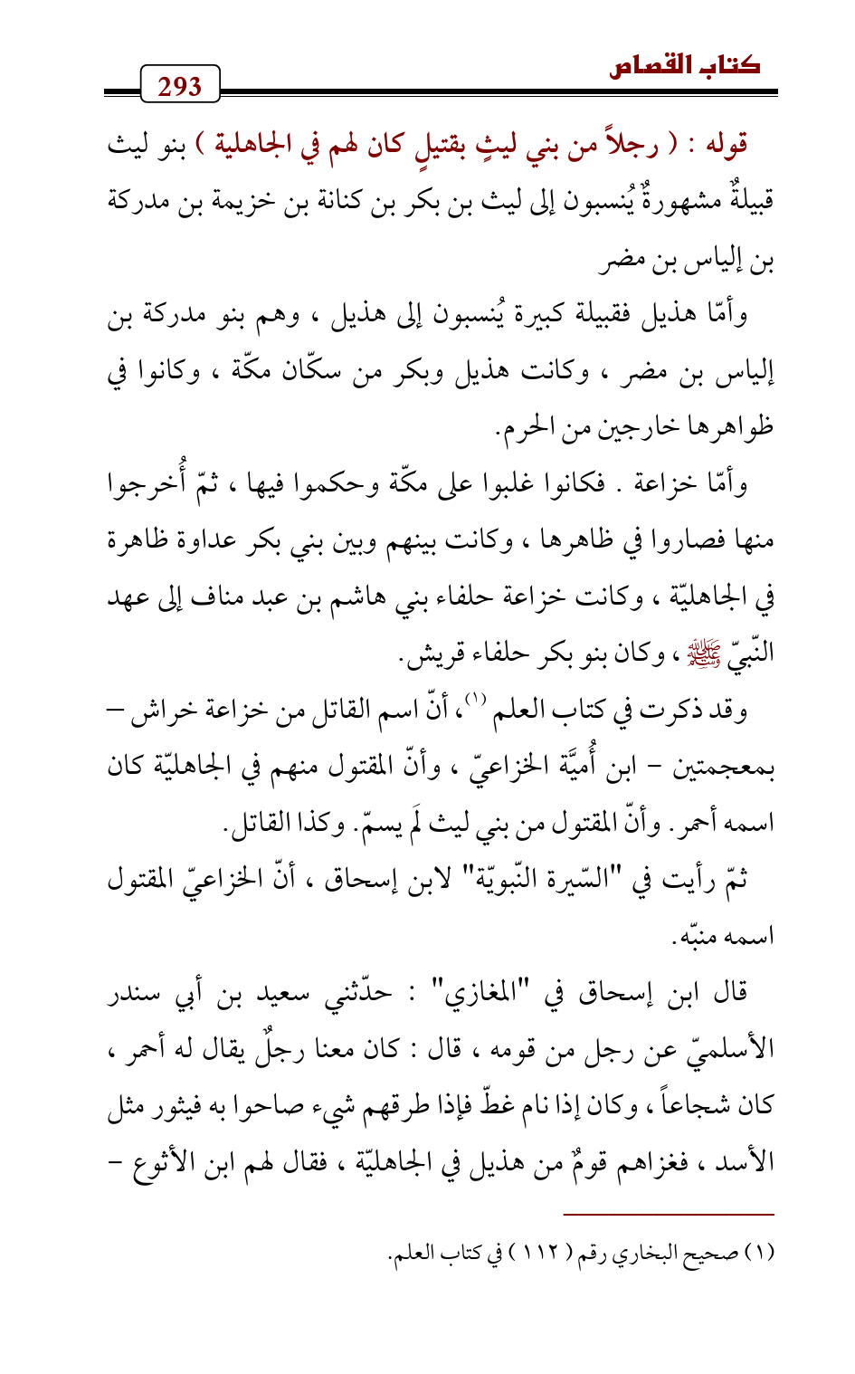 وقد ذكرت في كتاب العلم (¬1) , أنّ اسم القاتل من خزاعة خراش – بمعجمتين - ابن أُميَّة الخزاعيّ، وأنّ المقتول منهم في الجاهليّة كان اسمه أحمر. وأنّ المقتول من بني ليث لَم يسمّ. وكذا القاتل.