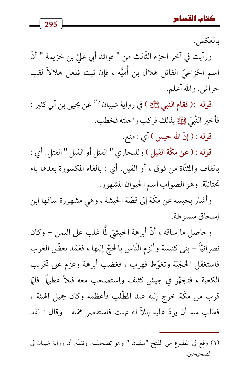 وحاصل ما ساقه , أنّ أبرهة الحبشيّ لَمَّا غلب على اليمن - وكان نصرانيّاً - بنى كنيسة وألزم النّاس بالحجّ إليها، فعَمَد بعضُ العرب فاستغفل الحَجَبَة وتغوّط فهرب، فغضب أبرهة وعزم على تخريب الكعبة، فتجهّز في جيش كثيف واستصحب معه فيلاً عظيماً. فلمّا قرب من مكّة خرج إليه عبد المطّلب فأعظمه وكان جميل الهيئة، فطلب منه أن يردّ عليه إبلاً له نهبت فاستقصر همّته. وقال: لقد
