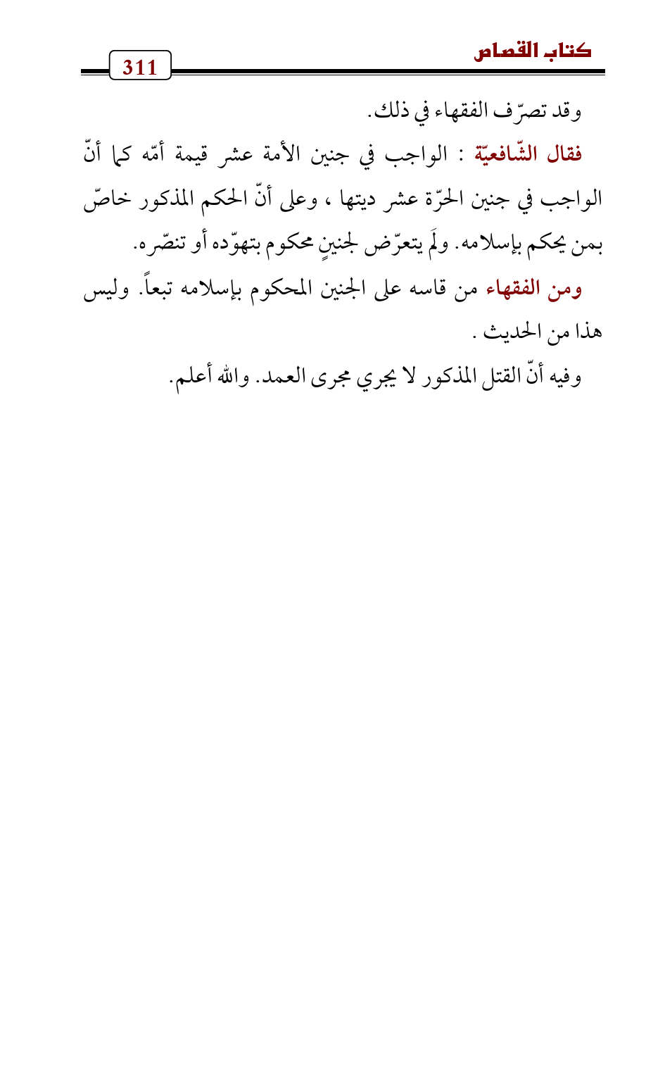 فقال الشّافعيّة: الواجب في جنين الأمة عشر قيمة أمّه كما أنّ الواجب في جنين الحرّة عشر ديتها، وعلى أنّ الحكم المذكور خاصّ بمن يحكم بإسلامه. ولَم يتعرّض لجنينٍ محكوم بتهوّده أو تنصّره.