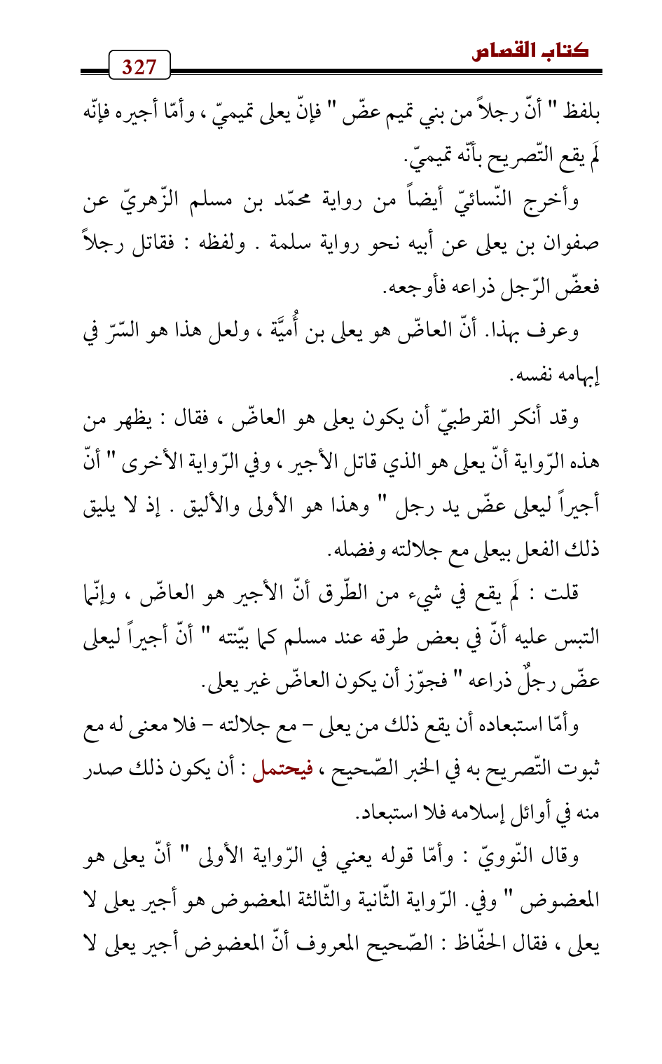 قلت: لَم يقع في شيء من الطّرق أنّ الأجير هو العاضّ , وإنّما التبس عليه أنّ في بعض طرقه عند مسلم كما بيّنته " أنّ أجيراً ليعلى عضّ رجلٌ ذراعه " فجوّز أن يكون العاضّ غير يعلى.