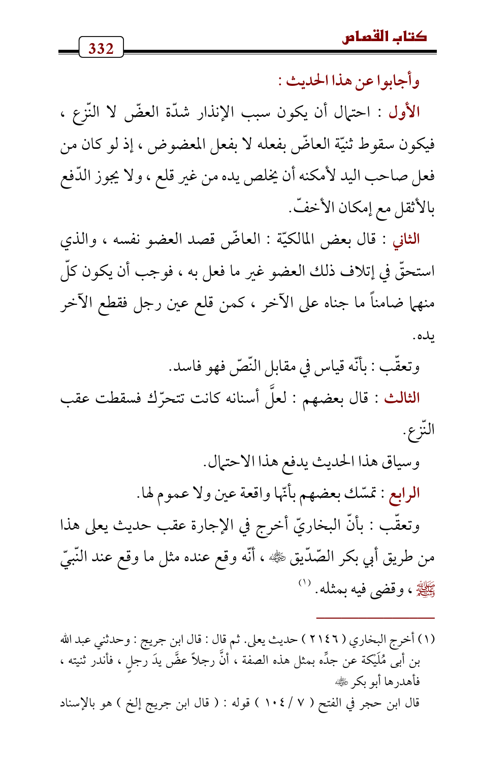 (¬1) أخرج البخاري (2146) حديث يعلى. ثم قال: قال ابن جريج: وحدثني عبد الله بن أبى مُلَيْكة عن جدِّه بمثل هذه الصفة , أنَّ رجلاً عضَّ يدَ رجلٍ، فأندر ثنيته، فأهدرها أبو بكر - رضي الله عنه -