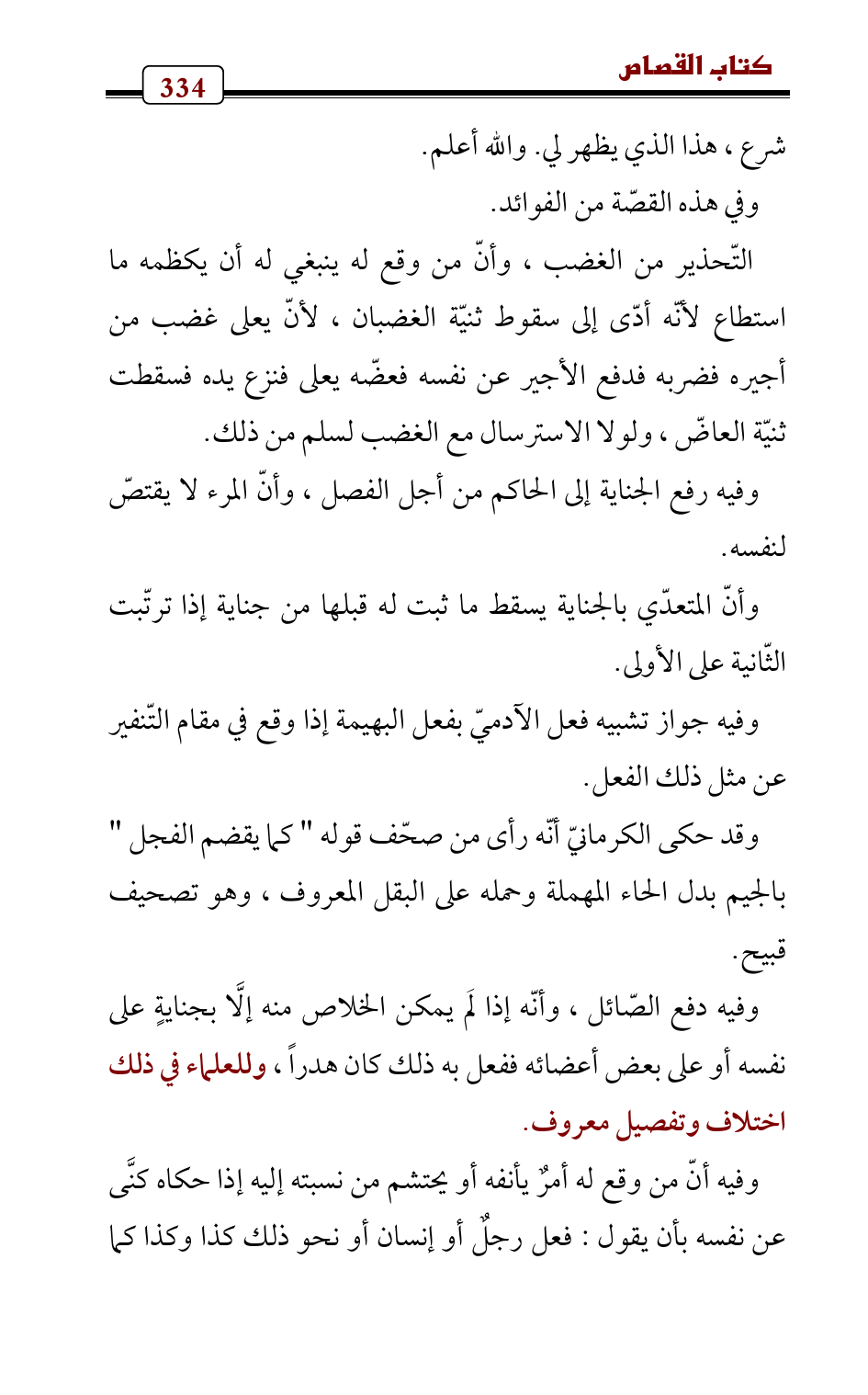 وفيه دفع الصّائل , وأنّه إذا لَم يمكن الخلاص منه إلَّا بجنايةٍ على نفسه أو على بعض أعضائه ففعل به ذلك كان هدراً، وللعلماء في ذلك اختلاف وتفصيل معروف.