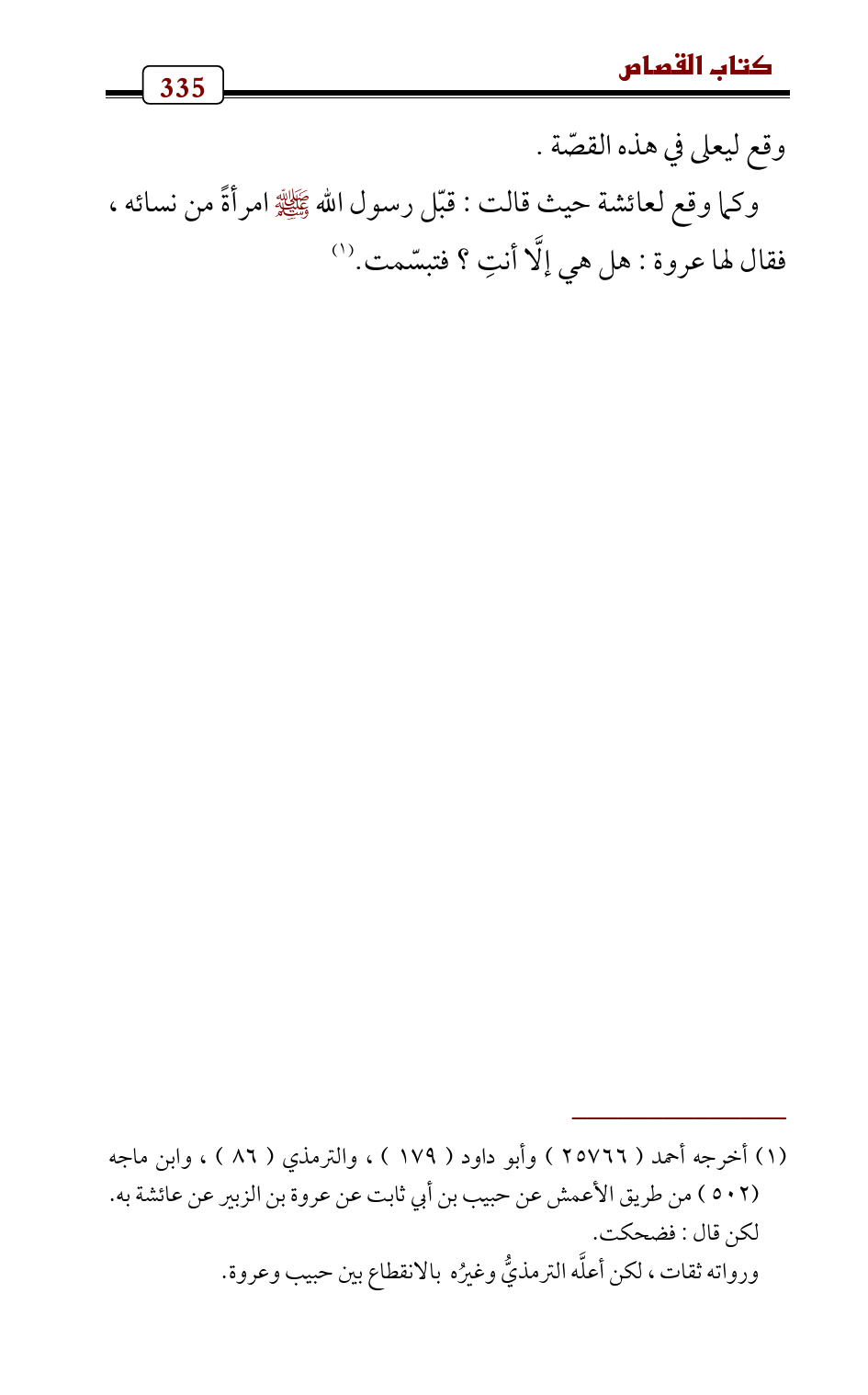 وكما وقع لعائشة حيث قالت: قبّل رسول الله - صلى الله عليه وسلم - امرأةً من نسائه، فقال لها عروة: هل هي إلَّا أنتِ؟ فتبسّمت. (¬1)
