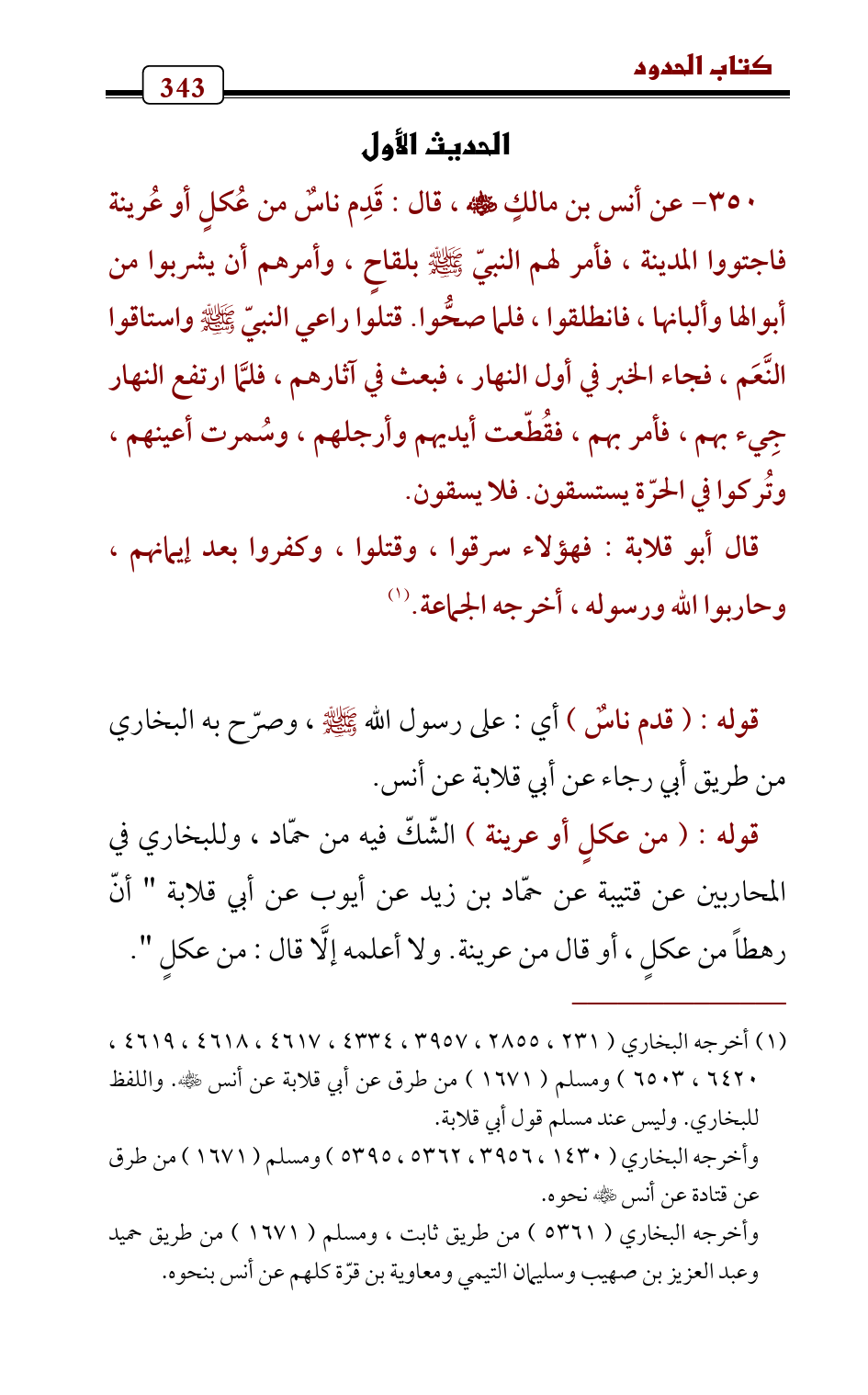 350 - عن أنس بن مالكٍ - رضي الله عنه - , قال: قَدِم ناسٌ من عُكلٍ أو عُرينة فاجتووا المدينة، فأمر لهم النبيّ - صلى الله عليه وسلم - بلقاحٍ، وأمرهم أن يشربوا من أبوالها وألبانها، فانطلقوا، فلما صحُّوا. قتلوا راعي النبيّ - صلى الله عليه وسلم - واستاقوا النَّعَم، فجاء الخبر في أول النهار، فبعث في آثارهم، فلمَّا ارتفع النهار جِيء بهم، فأمر بهم، فقُطّعت أيديهم وأرجلهم، وسُمرت أعينهم، وتُركوا في الحرّة يستسقون. فلا يسقون.