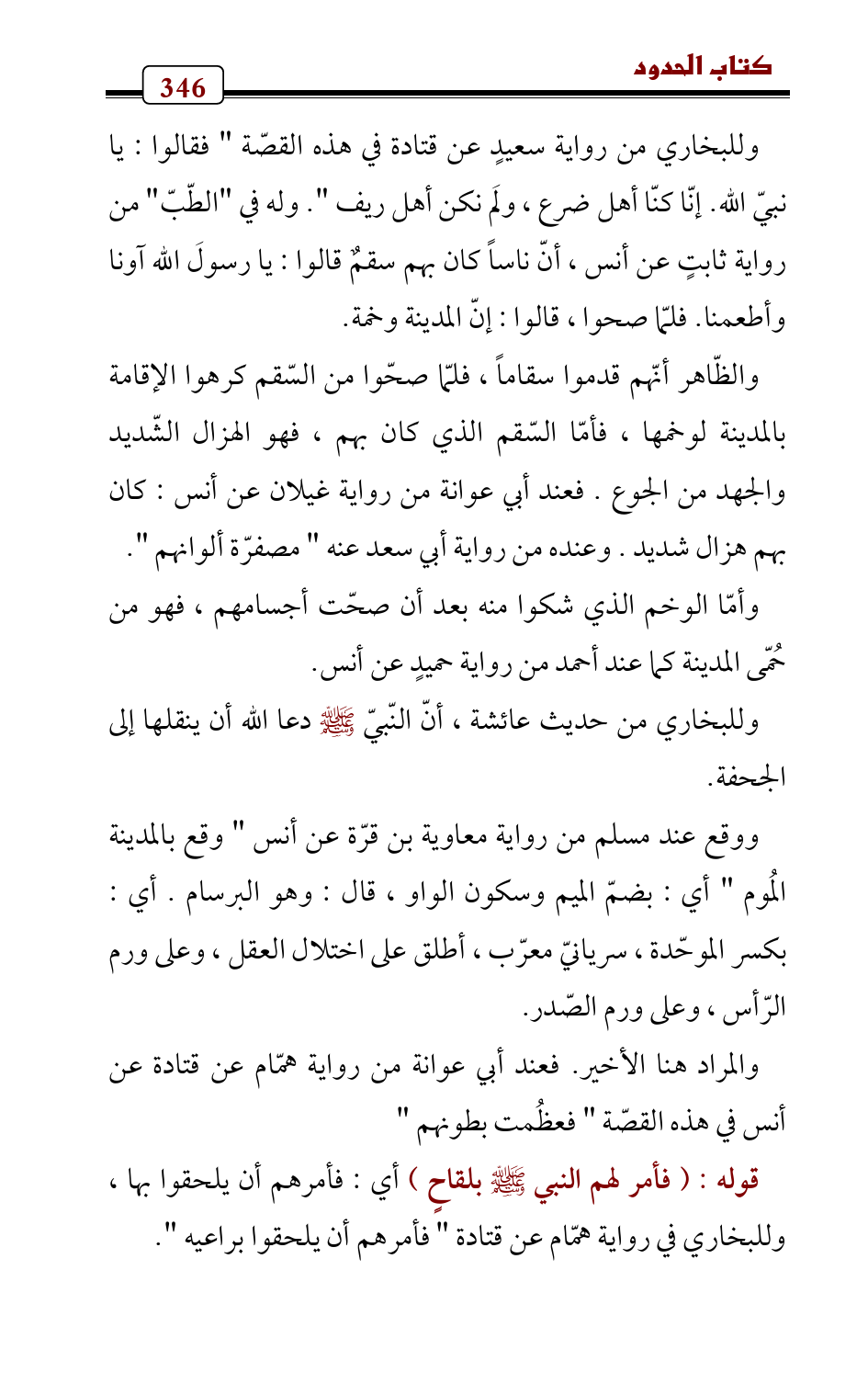 وللبخاري من رواية سعيدٍ عن قتادة في هذه القصّة " فقالوا: يا نبيّ الله. إنّا كنّا أهل ضرع , ولَم نكن أهل ريف ". وله في " الطّبّ " من رواية ثابتٍ عن أنس , أنّ ناساً كان بهم سقمٌ قالوا: يا رسولَ الله آونا وأطعمنا. فلمّا صحوا , قالوا: إنّ المدينة وخمة.