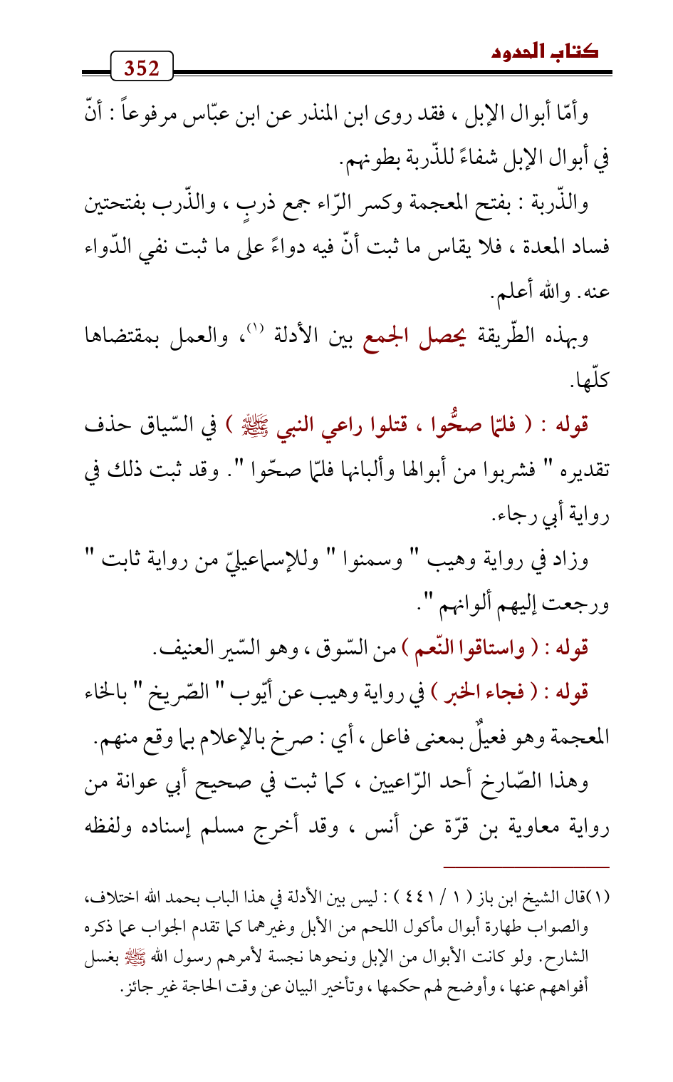 (¬1) قال الشيخ ابن باز (1/ 441): ليس بين الأدلة في هذا الباب بحمد الله اختلاف, والصواب طهارة أبوال مأكول اللحم من الأبل وغيرهما كما تقدم الجواب عما ذكره الشارح. ولو كانت الأبوال من الإبل ونحوها نجسة لأمرهم رسول الله - صلى الله عليه وسلم - بغسل أفواههم عنها , وأوضح لهم حكمها , وتأخير البيان عن وقت الحاجة غير جائز.
