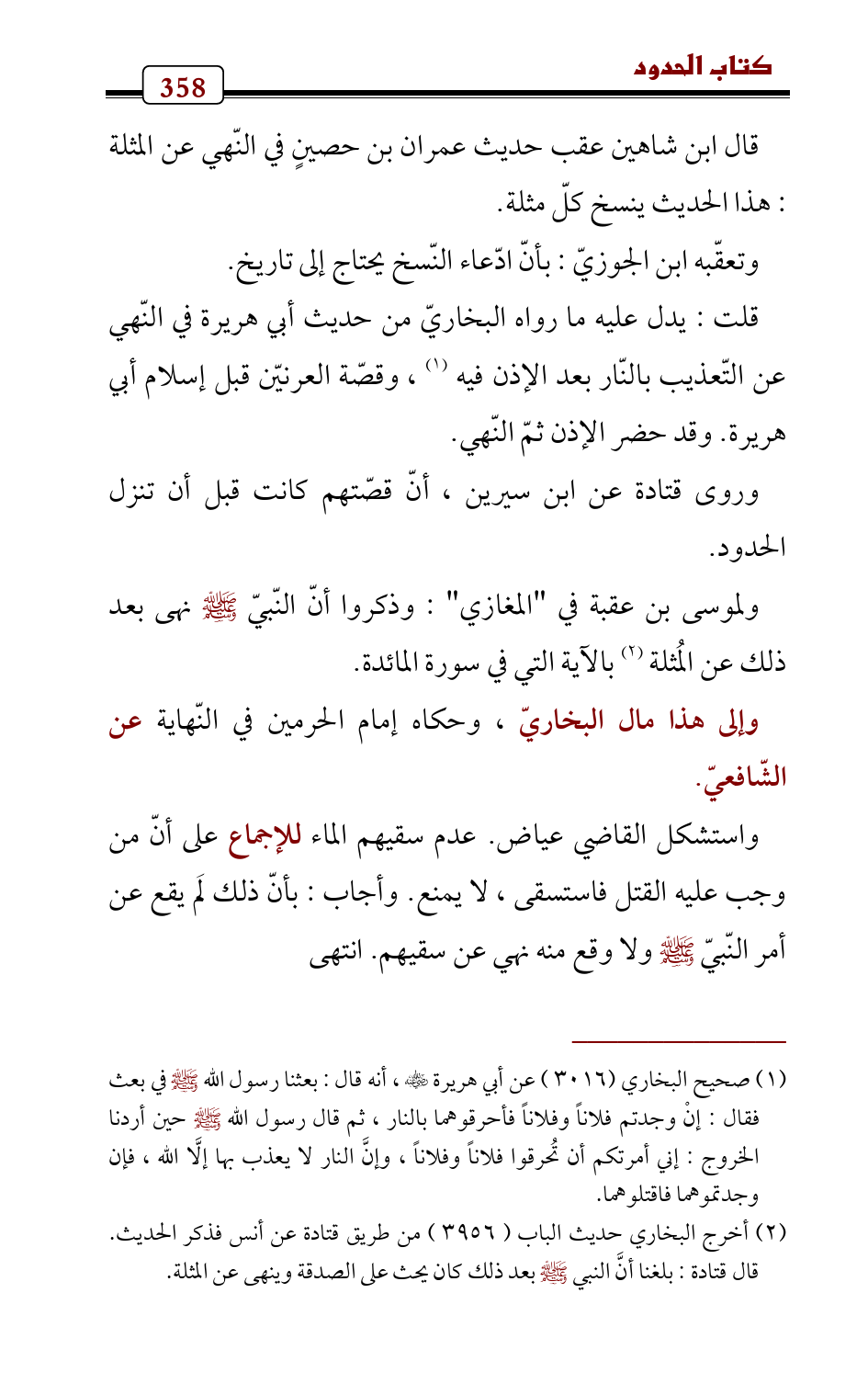 قال ابن شاهين عقب حديث عمران بن حصينٍ في النّهي عن المثلة: هذا الحديث ينسخ كلّ مثلة.