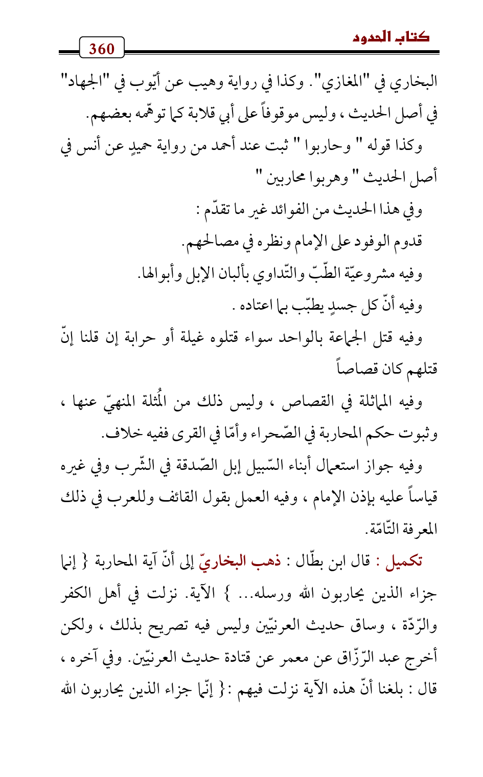 تكميل: قال ابن بطّال: ذهب البخاريّ إلى أنّ آية المحاربة {إنما جزاء الذين يحاربون الله ورسله ...} الآية. نزلت في أهل الكفر والرّدّة، وساق حديث العرنيّين وليس فيه تصريح بذلك، ولكن أخرج عبد الرّزّاق عن معمر عن قتادة حديث العرنيّين. وفي آخره , قال: بلغنا أنّ هذه الآية نزلت فيهم: {إنّما جزاء الذين يحاربون الله