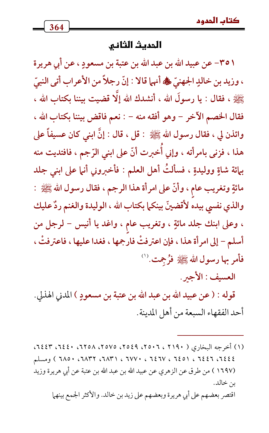351 - عن عبيد الله بن عبد الله بن عتبة بن مسعودٍ، عن أبي هريرة، وزيد بن خالدٍ الجهنيّ - رضي الله عنهم - أنهما قالا: إنّ رجلاً من الأعراب أتى النبيّ - صلى الله عليه وسلم - , فقال: يا رسولَ الله، أنشدك الله إلَّا قضيت بيننا بكتاب الله، فقال الخصم الآخر - وهو أفقه منه -: نعم فاقض بيننا بكتاب الله، وائذن لي، فقال رسول الله - صلى الله عليه وسلم -: قل، قال: إنَّ ابني كان عسيفاً على هذا، فزنى بامرأته، وإني أُخبرت أنّ على ابني الرّجم، فافتديت منه بمائة شاةٍ ووليدةٍ، فسألتُ أهل العلم: فأخبروني أنما على ابني جلد مائةٍ وتغريب عامٍ، وأنّ على امرأة هذا الرجم، فقال رسول الله - صلى الله عليه وسلم -: والذي نفسي بيده لأقضينّ بينكما بكتاب الله، الوليدة والغنم ردٌ عليك، وعلى ابنك جلد مائةٍ، وتغريب عامٍ، واغد يا أنيس - لرجل من أسلم - إلى امرأة هذا، فإن اعترفتْ فارجمها، فغدا عليها، فاعترفتْ، فأمر بها رسول الله - صلى الله عليه وسلم - فرُجِمت. (¬1)