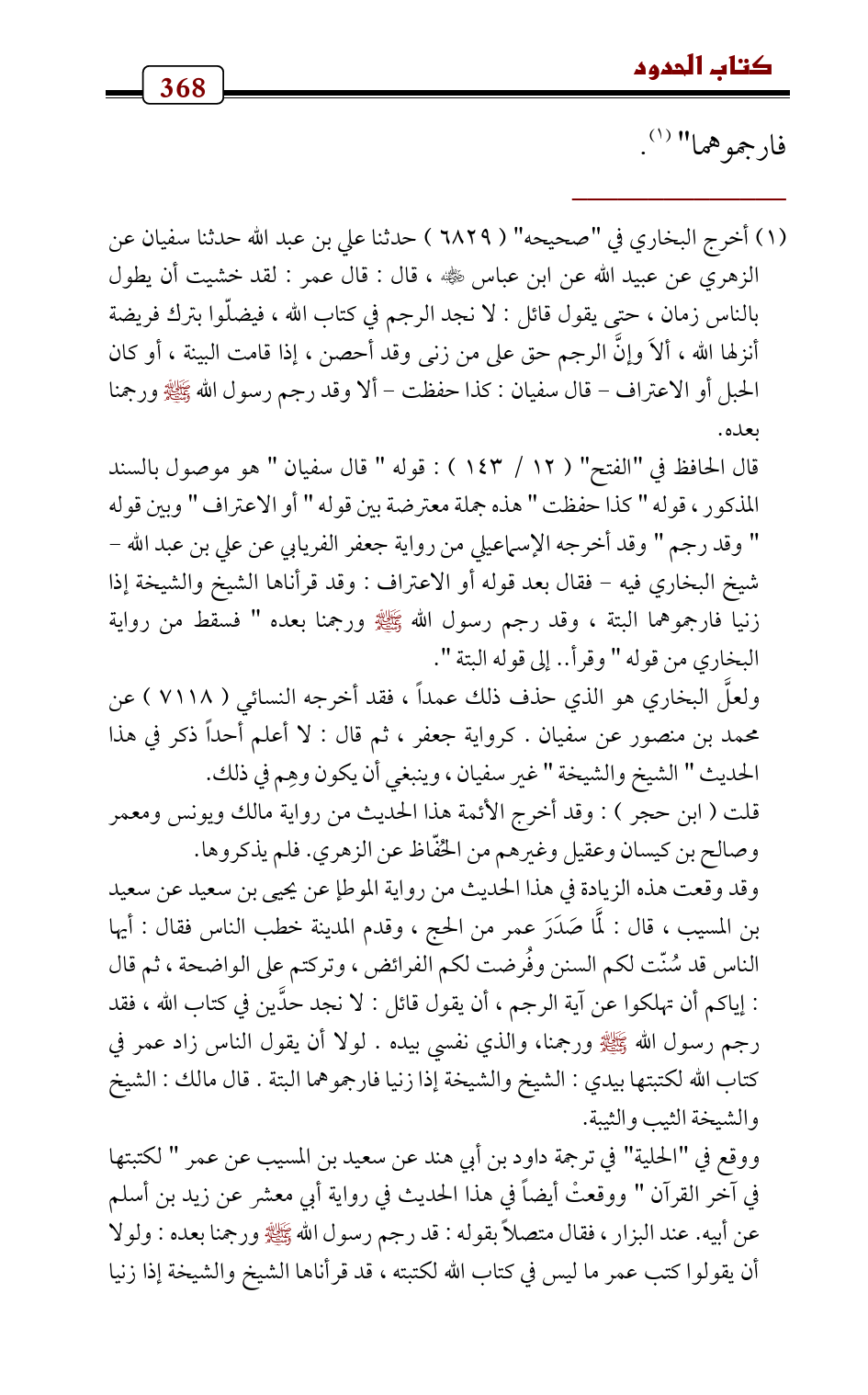 (¬1) أخرج البخاري في " صحيحه " (6829) حدثنا علي بن عبد الله حدثنا سفيان عن الزهري عن عبيد الله عن ابن عباس - رضي الله عنه -، قال: قال عمر: لقد خشيت أن يطول بالناس زمان، حتى يقول قائل: لا نجد الرجم في كتاب الله، فيضلّوا بترك فريضة أنزلها الله، ألاَ وإنَّ الرجم حق على من زنى وقد أحصن، إذا قامت البينة، أو كان الحبل أو الاعتراف - قال سفيان: كذا حفظت - ألا وقد رجم رسول الله - صلى الله عليه وسلم - ورجمنا بعده.