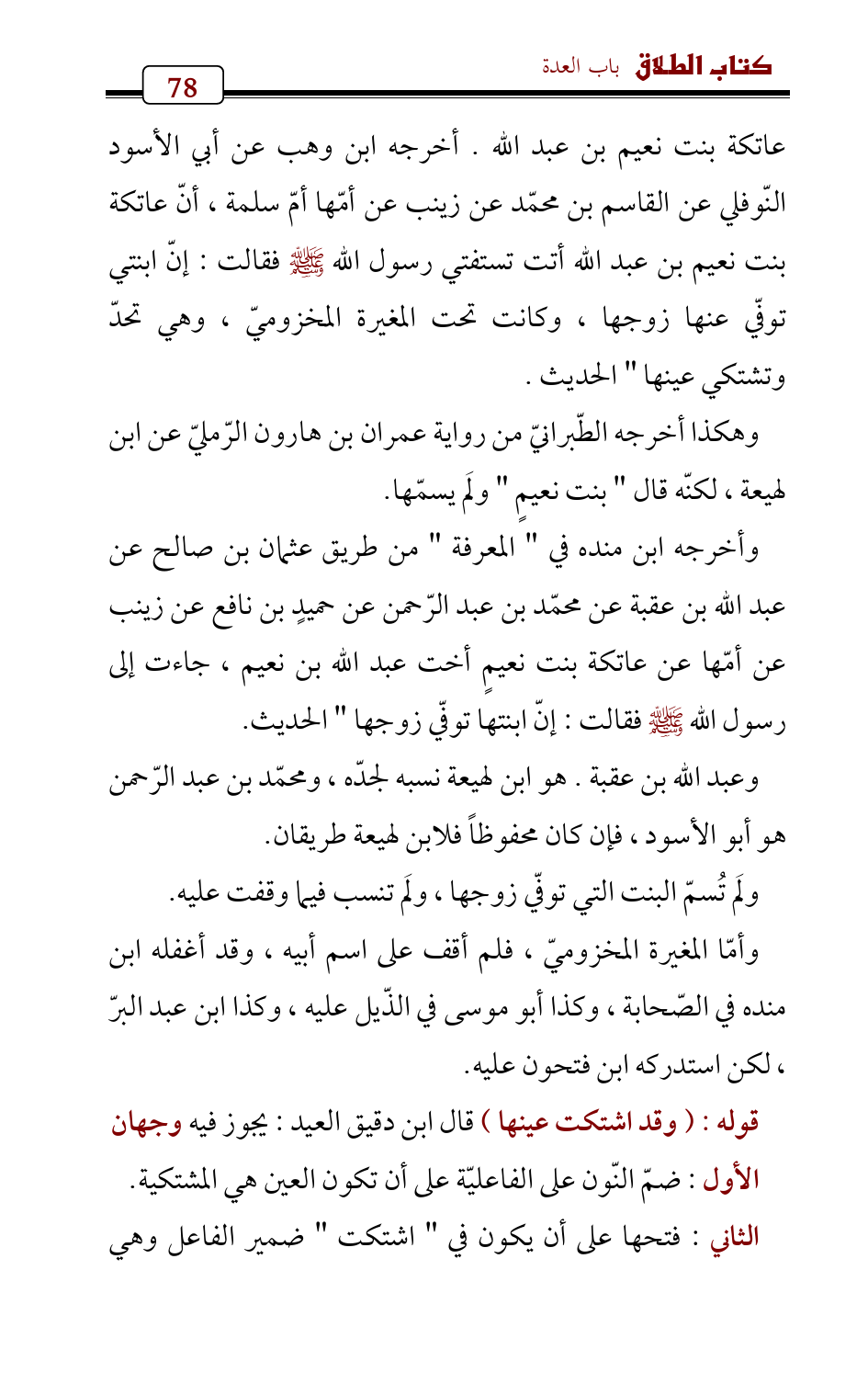 وأخرجه ابن منده في " المعرفة " من طريق عثمان بن صالح عن عبد الله بن عقبة عن محمّد بن عبد الرّحمن عن حميدٍ بن نافع عن زينب عن أمّها عن عاتكة بنت نعيمٍ أخت عبد الله بن نعيم , جاءت إلى رسول الله - صلى الله عليه وسلم - فقالت: إنّ ابنتها توفّي زوجها " الحديث.