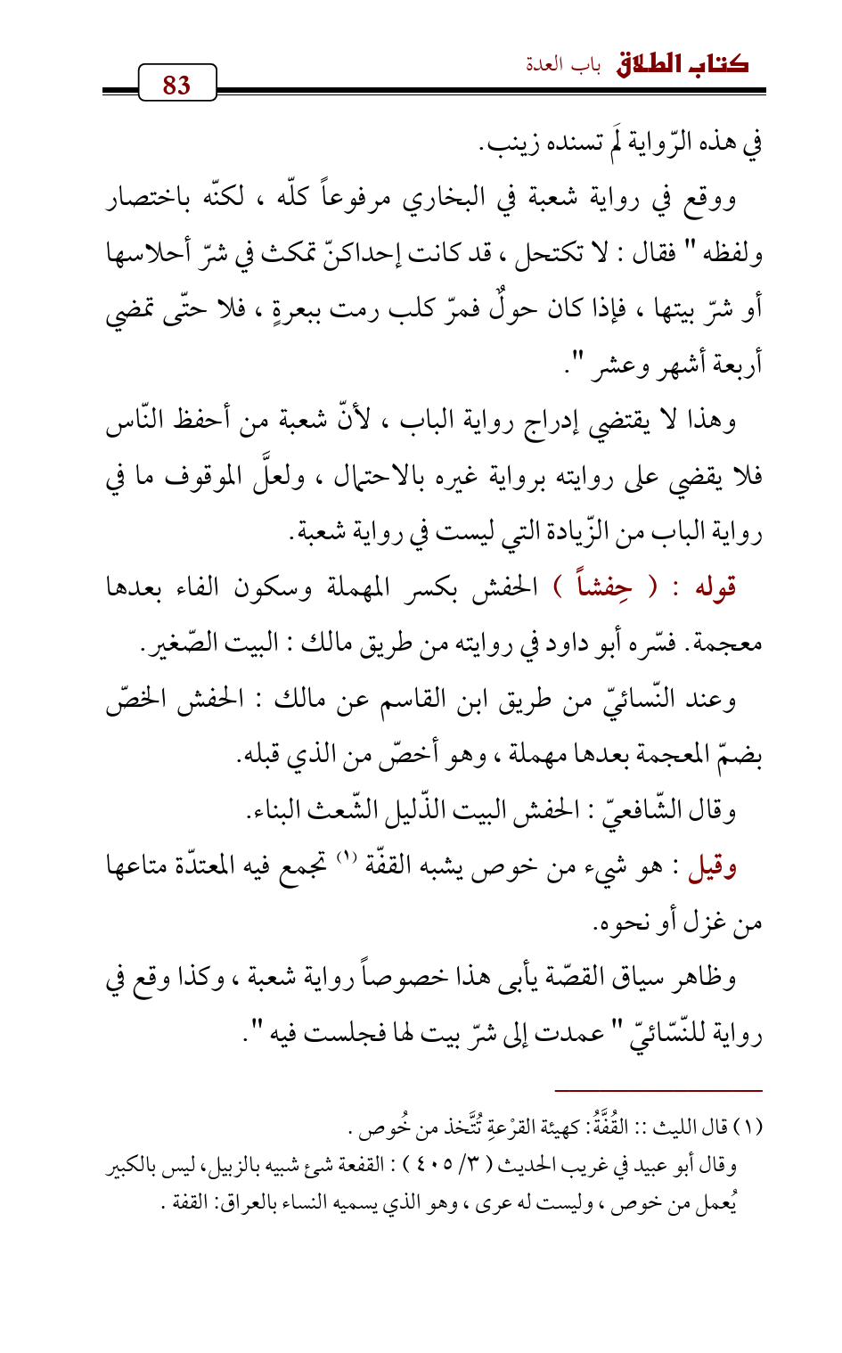 ووقع في رواية شعبة في البخاري مرفوعاً كلّه , لكنّه باختصار ولفظه " فقال: لا تكتحل، قد كانت إحداكنّ تمكث في شرّ أحلاسها أو شرّ بيتها، فإذا كان حولٌ فمرّ كلب رمت ببعرةٍ، فلا حتّى تمضي أربعة أشهر وعشر ".