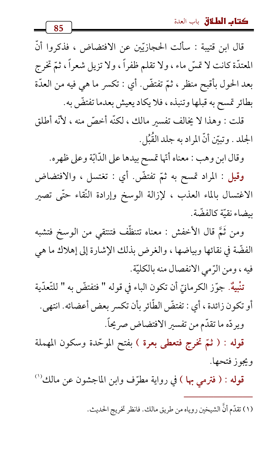 قال ابن قتيبة: سألت الحجازيّين عن الافتضاض , فذكروا أنّ المعتدّة كانت لا تمسّ ماء , ولا تقلم ظفراً , ولا تزيل شعراً , ثمّ تخرج بعد الحول بأقبح منظر , ثمّ تفتضّ. أي: تكسر ما هي فيه من العدّة بطائر تمسح به قبلها وتنبذه , فلا يكاد يعيش بعدما تفتضّ به.