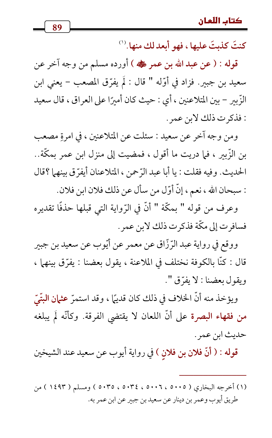 ومن وجه آخر عن سعيد: سئلت عن المتلاعنين , في امرةِ مصعب بن الزّبير , فما دريت ما أقول، فمضيت إلى منزل ابن عمر بمكّة .. الحديث. وفيه فقلت: يا أبا عبد الرّحمن، المتلاعنان أيفرّق بينهما؟ قال: سبحان الله، نعم، إنّ أوّل من سأل عن ذلك فلان ابن فلان.