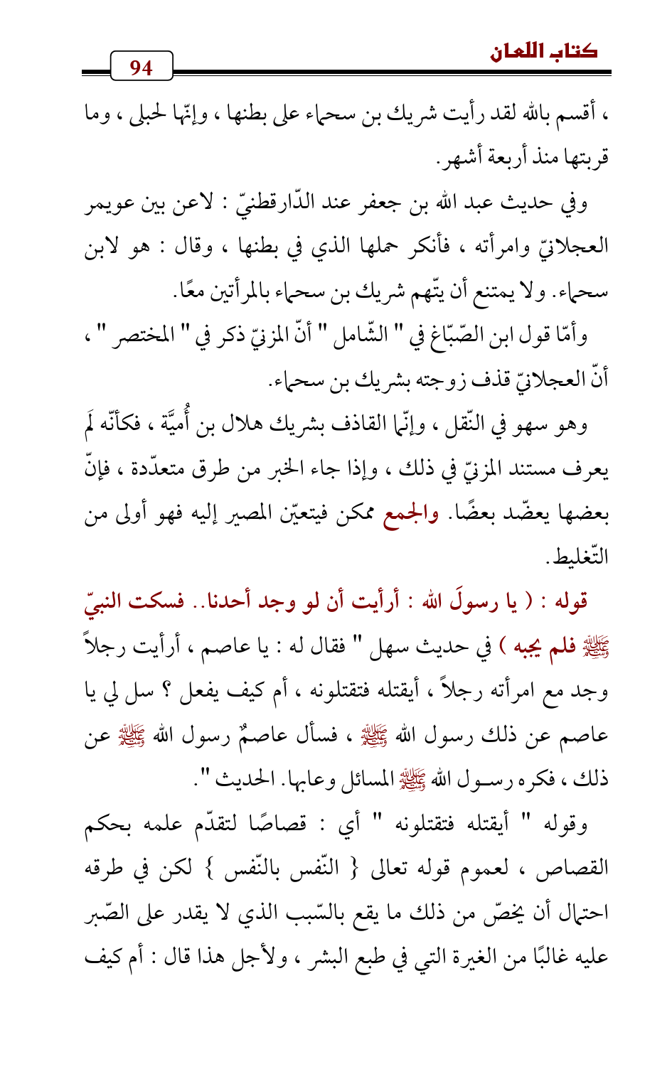 قوله: (يا رسولَ الله: أرأيت أن لو وجد أحدنا .. فسكت النبيّ - صلى الله عليه وسلم - فلم يجبه) في حديث سهل " فقال له: يا عاصم، أرأيت رجلاً وجد مع امرأته رجلاً، أيقتله فتقتلونه، أم كيف يفعل؟ سل لي يا عاصم عن ذلك رسول الله - صلى الله عليه وسلم -، فسأل عاصمٌ رسول الله - صلى الله عليه وسلم - عن ذلك، فكره رسول الله - صلى الله عليه وسلم - المسائل وعابها. الحديث ".