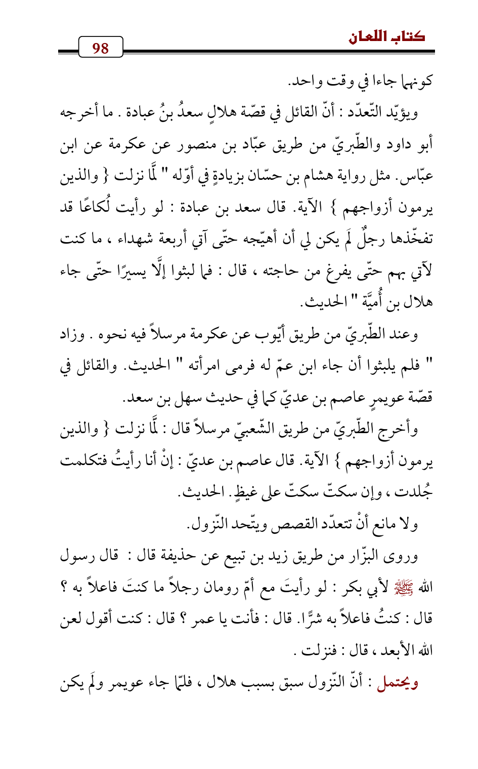 ويؤيّد التّعدّد: أنّ القائل في قصّة هلالٍ سعدُ بنُ عبادة. ما أخرجه أبو داود والطّبريّ من طريق عبّاد بن منصور عن عكرمة عن ابن عبّاس. مثل رواية هشام بن حسّان بزيادةٍ في أوّله " لَمَّا نزلت {والذين يرمون أزواجهم} الآية. قال سعد بن عبادة: لو رأيت لُكاعًا قد تفخّذها رجلٌ لَم يكن لي أن أهيّجه حتّى آتي أربعة شهداء، ما كنت لآتي بهم حتّى يفرغ من حاجته، قال: فما لبثوا إلَّا يسيرًا حتّى جاء هلال بن أُميَّة " الحديث.