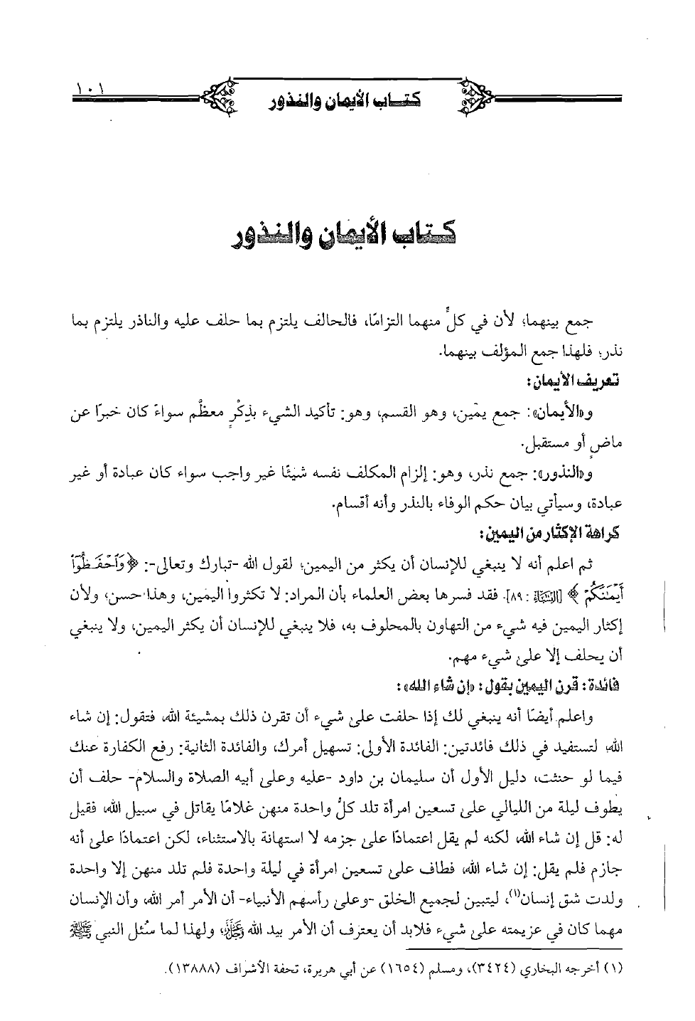 و«النذور»: جمع نذر، وهو: إلزام المكلف نفسه شيئا غير واجب سواء كان عبادة أو غير عبادة، وسيأتي بيان حكم الوفاء بالنذر وأنه أقسام.