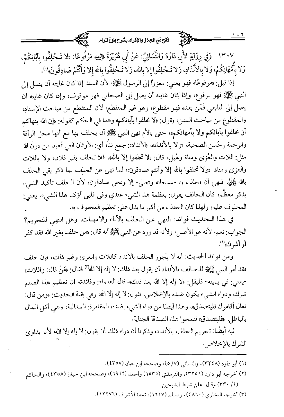 إذا قيل: «مرفوعا» فهو يعني: معزورا إلى الرسول صلى الله عليه وسلم؛ لأن السند إذا كان غايته أن يصل إلى النبي صلى الله عليه وسلم فهو مرفوع، وإذا كان غايته أن يصل إلى الصحابي فهو موقوف، وإذا كان غايته أن يصل إلى التابعي فمن بعده فهو مقطوع، وهو غير المنقطع؛ لأن المنقطع من مباحث الإسناد، والمقطوع من مباحث المتن، يقول: «لا تحلفوا بآبائكم» وهذا في الحكم كقوله: «إن الله ينهاكم أن تحلفوا بآبائكم ولا بأمهاتكم»، حتى بالأم نهى النبي صلى الله عليه وسلم أن يحلف بها مع أنها محل الرأفة والرحمة وحسن الصحبة، «ولا بالأنداد»، «الأنداد»: جمع ند، أي: الأوثان التي تعبد من دون الله مثل: اللات والعزى ومناة وهبل، قال: «لا تحلفوا إلا بالله»، فلا تحلف بقبر فلان، ولا باللات والعزى ومناة، «ولا تحلفوا بالله إلا وأنتم صادقون»، لما نهى عن الحلف بما ذكر بقي الحلف بالله عز وجل فنهى أن نحلف به-سبحانه وتعالى- إلا ونحن صادقون؛ لأن الحلف تأكيد الشيء بذكر معظم، كأن الحالف يقول: بعظمة هذا الشيء عندي وفي قلبي أؤكد هذا الشيء، يعني: المحلوف عليه؛ ولهذا كان الحلف من أكبر ما يدل على تعظيم المحلوف به.