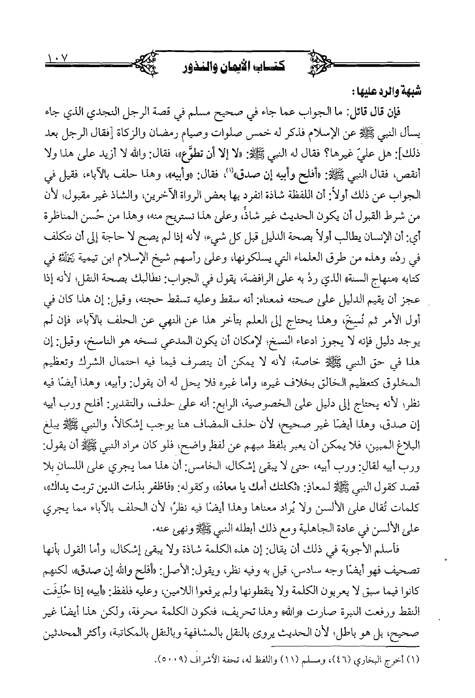 فإن قال قائل: ما الجواب عما جاء في صحيح مسلم في قصة الرجل النجدي الذي جاء يسأل النبي صلى الله عليه وسلم عن الإسلام فذكر له خمس صلوات وصيام رمضان والزكاة [فقال الرجل بعد ذلك]: هل علي غيرها؟ فقال له النبي صلى الله عليه وسلم: «لا إلا تطوع»، فقال: والله لا أزيد على هذا ولا أنقص، فقال النبي صلى الله عليه وسلم: «أفلح وأبيه إن صدق»، فقال: «وأبيه»، وهذا حلف بالآباء، فقيل في الجواب عن ذلك أولا: أن اللفظة شاذة انفرد بها بعض الرواة الآخرين، والشاذ غير مقبول؛ لأن من شرط القبول أن يكون الحديث غير شاذ وعلى هذا نستريح منه، وهذا من حسن المناظرة أي: أن الإنسان يطالب أولا بصحة الدليل قبل كل شيء؛ لأنه إذا لم يصح لا حاجة إلى أن نتكلف في رده، وهذه من طرق العلماء التي يسلكونها، وعلى رأسهم شيخ الإسلام ابن تيمية رحمه الله في كتابه «منهاج السنة» الذي رد به على الرافضة، يقول في الجواب: نطالبك بصحة النقل؛ لأنه إذا عجز أن يقيم الدليل على صحته فمعناه: أنه سقط وعليه تسقط حجته، وقيل: إن هذا كان في أول الأمر ثم نسخ، وهذا يحتاج إلى العلم بتأخر هذا عن النهي عن الحلف بالآباء، فإن لم يوجد دليل فإنه لا يجوز ادعاء النسخ؛ لإمكان أن يكون المدعي نسخه هو الناسخ، وقيل: إن هذا في حق النبي صلى الله عليه وسلم خاصة؛ لأنه لا يمكن أن يتصرف فيما فيه احتمال الشرك وتعظيم المخلوق كتعظيم الخالق بخلاف غيره، وأما غيره فلا يحل له أن يقول: وأبيه، وهذا أيضا فيه نظر؛ لأنه يحتاج إلى دليل على الخصوصية، الرابع: أنه على حذف، والتقدير: أفلح ورب أبيه إن صدق، وهذا أيضا غير صحيح، لأن حذف المضاف هنا يوجب إشكالا، والنبي صلى الله عليه وسلم يبلغ البلاغ المبين، فلا يمكن أن يعبر بلفظ مبهم عن لفظ واضح، فلو كان مراد النبي صلى الله عليه وسلم أن يقول: ورب أبيه لقال: ورب أبيه، حتى لا يبقى إشكال، الخامس: أن هذا مما يجري على اللسان بلا قصد كقول النبي صلى الله عليه وسلم لمعاذ: «ثكلتك أمك يا معاذ»، وكقوله: «فاظفر بذات الدين تربت يداك»، كلمات تقال على الألسن ولا يراد معناها وهذا أيضا فيه نظر؛ لأن الحلف بالآباء مما يجري على الألسن في عادة الجاهلية ومع ذلك أبطله النبي صلى الله عليه وسلم ونهى عنه.