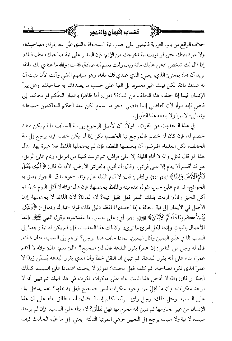 في هذا الحديث من الفوائد: أولا: أن الأصل الرجوع إلى نية الحالف ما لم يكن هناك خصم له، فإن كان له خصم فالمرجع نية الخصم، لكن إذا لم يكن خصم فإنه يرجع إلى نية الحالف، لكن العلماء افترضوا أن يحتملها اللفظ، فإن لم يحتملها اللفظ فلا عبرة بها، مثال هذا: لو قال قائل: والله لا أنام الليلة إلا على فراش، ثم توسد كثيبا من الرمل، ونام على الرمل، هو قد أقسم ألا ينام على فراش، وقال: أنا أنوي بالفراش الأرض؛ لأن الله قال: {الذى جعل لكم الأرض فرشا} [البقرة: 22]. والثاني: قال: لا أنام الليلة على وتد-عود يدق بالجوار يعلق به الحوائج- ثم نام على جبل، نقول هذه نيته واللفظ يحتملها، فإن قال: والله لا آكل اليوم خبزا ثم أكل الخبز وقال: أردت بذلك التمر فهل تقبل نيته؟ لا، لماذا؟ لأن اللفظ لا يحتملها. إذن الأصل في الأيمان لإلى نية الحالف إذا احتملها اللفظ، دليل ذلك قوله-تبارك وتعالى-: {ولكن يؤاخذكم بما عقدتم الأيسن} [المائدة: 89] أي: على حسب ما عقدتموه، وقول النبي صلى الله عليه وسلم: «إنما الاعمال بالنيات وإنما لكل امرئ ما نوى»، وكذلك هذا الحديث، فإن لم يكن له نية رجعنا إلى السبب الذي هيج اليمين وأثار اليمين، لماذا حلف هذا الرجل؟ نرجع إلى السبب، مثال ذلك: قال له رجل من الناس: إن عمرا يقرر البدعة قال له: صحيح؟ قال: نعم، قال: والله لا أكلم عمرا الذي ذكره لصاحبه، ثم كلمه فهل يحنث؟ نقول: لا يحنث اعتمادا على السبب، كذلك أيضا لو قال: والله لا أدخل هذا البيت بناء على منكرات ذكرت في هذا البلد ثم تبين أنه لا يوجد منكرات، وأن ما نقل عن وجود منكرات ليس بصحيح فهل يدخلها؟ نعم يدخل بناء على السبب، ومثل ذلك: رجل رأى امرأته تكلم إنسانا فقال: أنت طالق بناء على أن هذا الإنسان من غير محارمها ثم تبين أنه محرم لها فهل تطلق؟ لا، بناء على السبب، فإن لم يوجد سبب، لا نية ولا سبب يرجع إلى التعيين-وهي المرتبة الثالثة- يعني: إلى ما عينه الحادث كيف