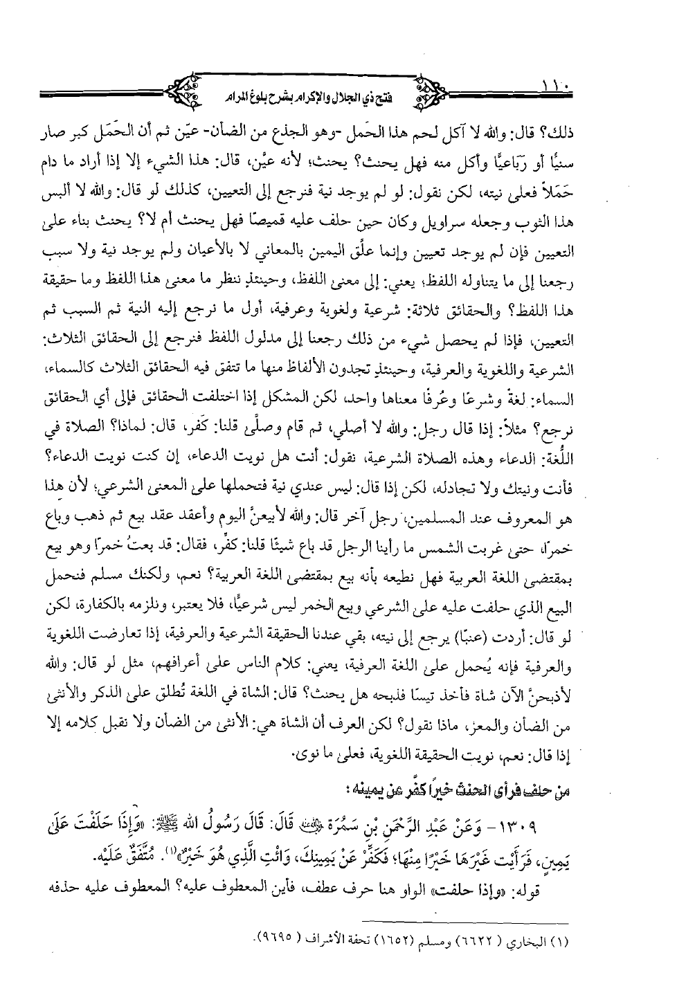 ذلك؟ قال: والله لا آكل لحم هذا الحمل-وهو الجذع من الضأن- عين ثم أن الحمل كبر صار سنيا أو رباعيا وأكل منه فهل يحنث؟ يحنث؛ لأنه عين، قال: هذا الشيء إلا إذا أراد ما دام حملا فعلى نيته، لكن نقول: لو لم يوجد نية فنرجع إلى التعيين، كذلك لو قال: والله لا ألبس هذا الثوب وجعله سراويل وكان حين حلف عليه قميصا فهل يحنث أم لا؟ يحنث بناء على التعيين فإن لم يوجد تعيين وإنما علق اليمين بالمعاني لا بالأعيان ولم يوجد نية ولا سبب رجعنا إلى ما يتناوله اللفظ؛ يعني: إلى معنى اللفظ، وحينئذ ننظر ما معنى هذا اللفظ وما حقيقة هذا اللفظ؟ والحقائق ثلاثة: شرعية ولغوية وعرفية، أول ما نرجع إليه النية ثم السبب ثم التعيين، فإذا لم يحصل شيء من ذلك رجعنا إلى مدلول اللفظ فنرجع إلى الحقائق الثلاث: الشرعية واللغوية والعرفية، وحينئذ تجدون الألفاظ منها ما تتفق فيه الحقائق الثلاث كالسماء، السماء: لغة وشرعا وعرفا معناها واحد، لكن المشكل إذا اختلفت الحقائق فإلى أي الحقائق نرجع؟ مثلا: إذا قال رجل: والله لا أصلي، ثم قام وصلى قلنا: كفر، قال: لماذا؟ الصلاة في اللغة: الدعاء وهذه الصلاة الشرعية، نقول: أنت هل نويت الدعاء، إن كنت نويت الدعاء؟ فأنت ونيتك ولا تجادله، لكن إذا قال: ليس عندي نية فتحملها على المعنى الشرعي؛ لأن هذا هو المعروف عند المسلمين، رجل آخر قال: والله لأبيعن اليوم وأعقد عقد بيع ثم ذهب وباع خمرا، حتى غربت الشمس ما رأينا الرجل قد باع شيئا قلنا: كفر، فقال: قد بعت خمرا وهو بيع بمقتضى اللغة العربية فهل نطيعه بأنه بيع بمقتضى اللغة العربية؟ نعم، ولكنك مسلم فنحمل البيع الذي حلفت عليه على الشرعي وبيع الخمر ليس شرعيا، فلا يعتبر، ونلزمه بالكفارة، لكن لو قال: أردت (عنبا) يرجع إلى نيته، بقي عندنا الحقيقة الشرعية والعرفية، إذا تعارضت اللغوية والعرفية فإنه يحمل على اللغة العرفية، يعني: كلام الناس على أعرافهم، مثل لو قال: والله لأذبحن الآن شاة فأخذ تيسا فذبحه هل يحنث؟ قال: الشاة في اللغة تطلق على الذكر والأنثى من الضان والمعز، ماذا تقول؟ لكن العرف أن الشاة هي: الأنثى من الضان ولا نقبل كلامه إلا إذا قال: نعم، نويت الحقيقة اللغوية، فعلى ما نوى.