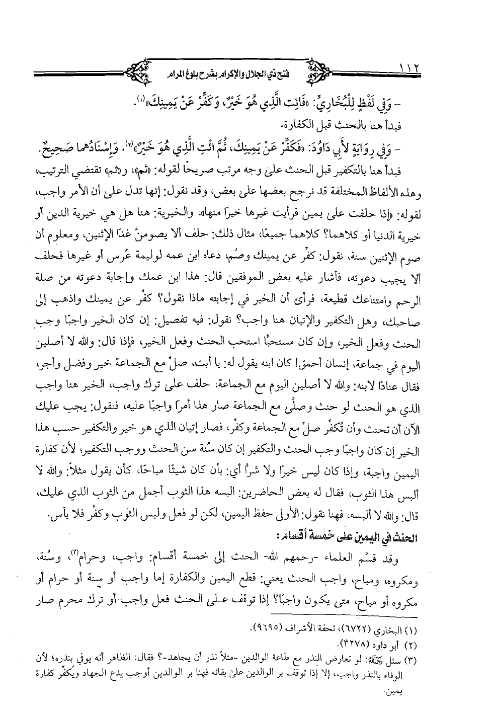 فبدأ هنا بالتكفير قبل الحنث على وجه مرتب صريحا لقوله: «ثم»، و «ثم» تقتضي الترتيب، وهذه الألفاظ المختلفة قد نرجح بعضها على بعض، وقد نقول: إنها تدل على أن الأمر واجب، لقوله: «إذا حلفت على يمين فرأيت غيرها خيرا منها»، والخيرية: هنا هل هي خيرية الدين أو خيرية الدنيا أو كلاهما؟ كلاهما جميعا، مثال ذلك: حلف ألا يصومن غدا الإثنين، ومعلوم أن صوم الإثنين سنة، نقول: كفر عن يمينك وصم، دعاه ابن عمه لوليمة عرس أو غيرها فحلف ألا يجيب دعوته، فأشار عليه بعض الموفقين قال: هذا ابن عمك وإجابة دعوته من صلة الرحم وامتناعك قطيعة، فرأى أن الخير في إجابته ماذا تقول؟ كفر عن يمينك واذهب إلى صاحبك، وهل التكفير والإتيان هنا واجب؟ نقول: فيه تفصيل: إن كان الخير واجبا وجب الحنث وفعل الخير، وإن كان مستحبا استحب الحنث وفعل الخير، فإذا قال: والله لا أصلين اليوم في جماعة، إنسان أحمق! كان ابنه يقول له: يا أبت، صل مع الجماعة خير وفضل وأجر، فقال عنادا لابنه: والله لا أصلين اليوم مع الجماعة، حلف على ترك واجب، الخير هنا واجب الذي هو الحنث لو حنث وصلى مع الجماعة صار هذا أمرا واجبا عليه، فنقول: يجب عليك الآن أن تحنث وأن تكفر صل مع الجماعة وكفر، فصار إتيان الذي هو خير والتكفير حسب هذا الخير أن كان واجبا وجب الحنث والتكفير إن كان سنة سن الحنث ووجب التكفير، لأن كفارة اليمين واجبة، وإذا كان ليس خيرا ولا شرا أي: بأن كان شيئا مباحا، كأن يقول مثلا: والله لا ألبس هذا الثوب، فقال له بعض الحاضرين: البسه هذا الثوب أجمل من الثوب الذي عليك، قال: والله لا ألبسه، فهنا نقول: الأولى حفظ اليمين، لكن لو فعل ولبس الثوب وكفر فلا بأس.