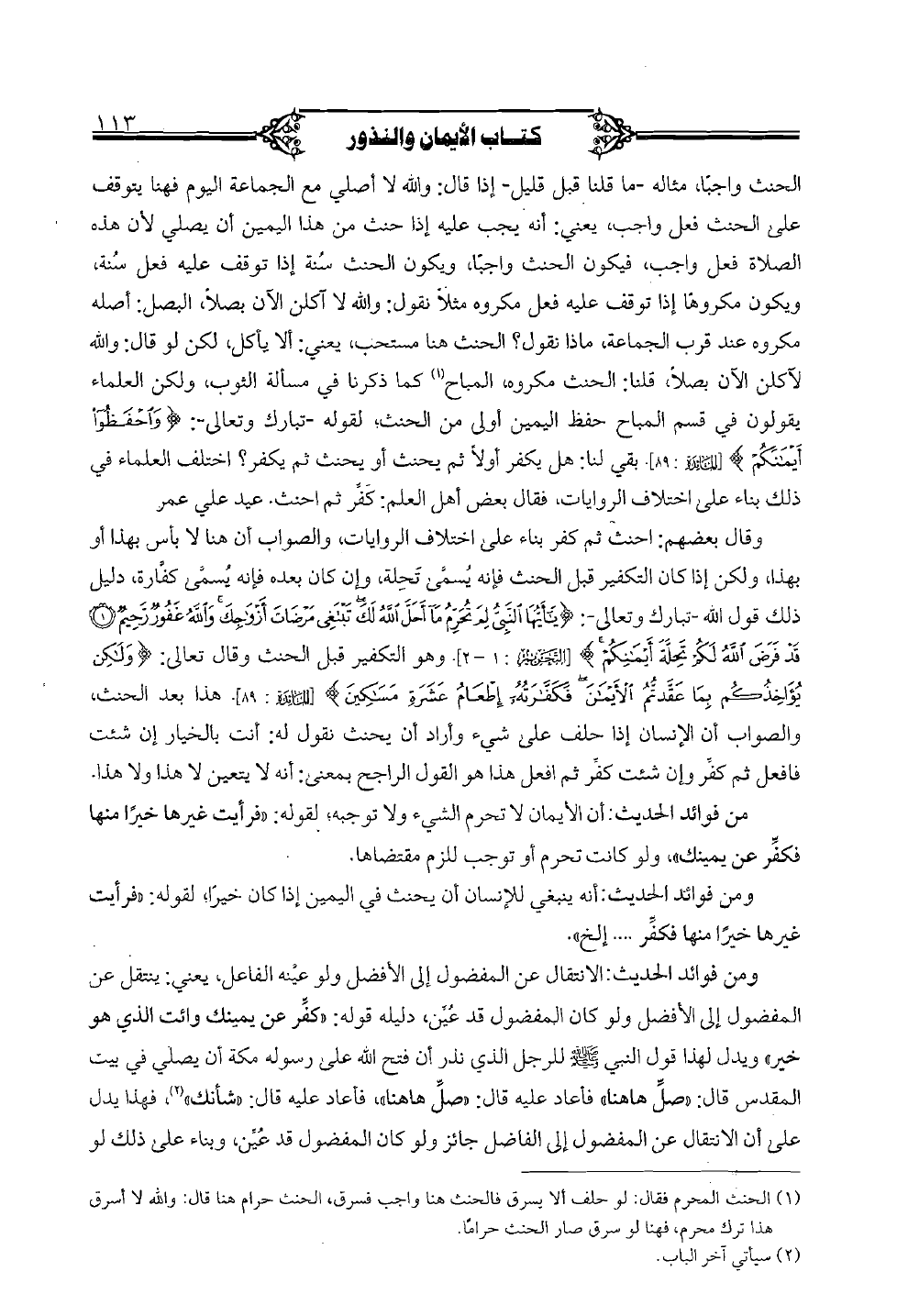 الحنث واجبا مثاله-ما قلنا قبل قليل- إذا قال: والله لا أصلي مع الجماعة اليوم فهنا يتوقف على الحنث فعل واجب، يعني: أنه يجب عليه إذا حنث من هذا اليمين أن يصلي لأن هذه الصلاة فعل واجب، فيكون الحنث واجبا، ويكون الحنث سنة إذا توقف عليه فعل سنة، ويكون مكروها إذا توقف عليه فعل مكروه مثلا نقول: والله لا آكلن الآن بصلا، البصل: أصله مكروه عند قرب الجماعة، ماذا نقول؟ الحنث هنا مستحب، يعني: ألا يأكل، لكن لو قال: والله لآكلن الآن بصلا، قلنا: الحنث مكروه، المباح كما ذكرنا في مسألة الثوب، ولكن العلماء يقولون في قسم المباح حفظ اليمين أولى من الحنث؛ لقوله-تبارك وتعالى-: {واحفظوا أيمنكم} [المائدة: 89]. بقي لنا: هل يكفر أولا ثم يحنث أو يحنث ثم يكفر؟ اختلف العلماء في ذلك بناء على اختلاف الروايات، فقال بعض أهل العلم: كفر ثم احنث. عيد على عمر