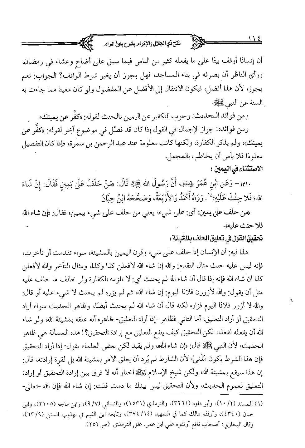 1310 - وعن ابن عمر رضى الله عنه، أن رسول الله صلى الله عليه وسلم قال: «من حلف على يمين فقال: إن شاء الله؛ فلا حنث عليه». رواه أحمد والأربعة، وصححه ابن حبان