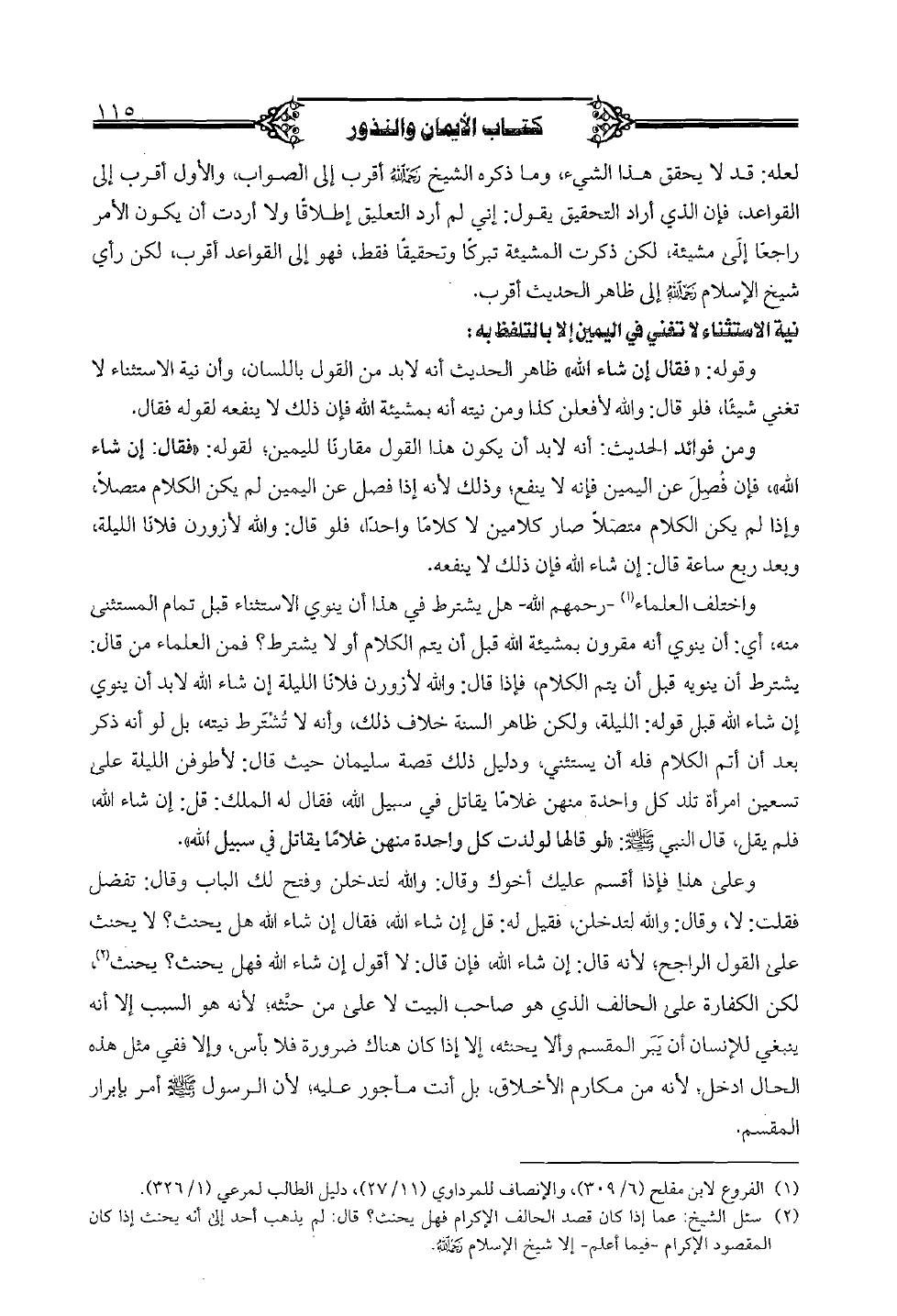 واختلف العلماء-رحمهم الله- هل يشترط في هذا أن ينوي الاستثناء قبل تمام المستثنى منه، أي: أن ينوي أنه مقرون بمشيئة الله قبل أن يتم الكلام أو لا يشترط؟ فمن العلماء من قال: يشترط أن ينويه قبل أن يتم الكلام، فإذا قال: والله لأزورن فلانا الليلة إن شاء الله لابد أن ينوي إن شاء الله قبل قوله: الليلة، ولكن ظاهر السنة خلاف ذلك، وأنه لا تشترط نيته، بل لو أنه ذكر بعد أن أتم الكلام فله أن يستثني، ودليل ذلك قصة سليمان حيث قال: لأطوفن الليلة على تسعين امرأة تلد كل واحدة منهن غلاما يقاتل في سبيل الله، فقال له الملك: قل: إن ةشاء الله، فلم يقل، قال النبي صلى الله عليه وسلم: «لو قالها لولدت كل واحدة منهن غلاما يقاتل في سبيل الله».