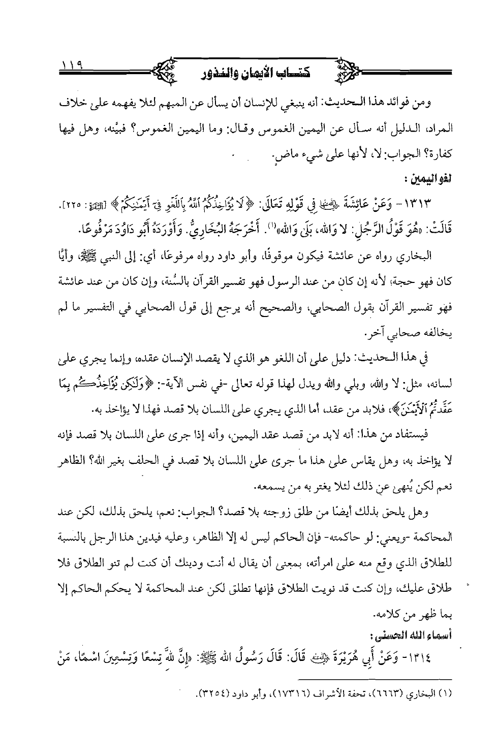 1313 - وعن عائشة رضي الله عنها في قوله تعالى: {لا يؤاخذكم الله باللغو فى أيمنكم} [البقرة: 225]. قالت: «هو قول الرجل: لا والله، بلى والله». أخرجه البخاري. وأورده أبو داود مرفوعا.
