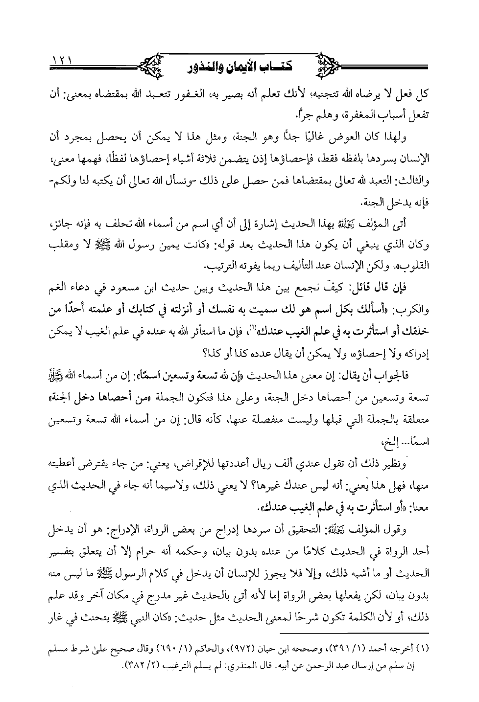 فالجواب أن يقال: إن معنى هذا الحديث "إن لله تسعة وتسعين اسمًا": إن من أسماء الله عز وجل تسعة وتسعين من أحصاها دخل الجنة، وعلى هذا فتكون الجملة "من أحصاها دخل الجنة" متعلقة بالجملة التي قبلها وليست منفصلة عنها، كأنه قال: إن من أسماء الله تسعة وتسعين اسمًا ... الخ.