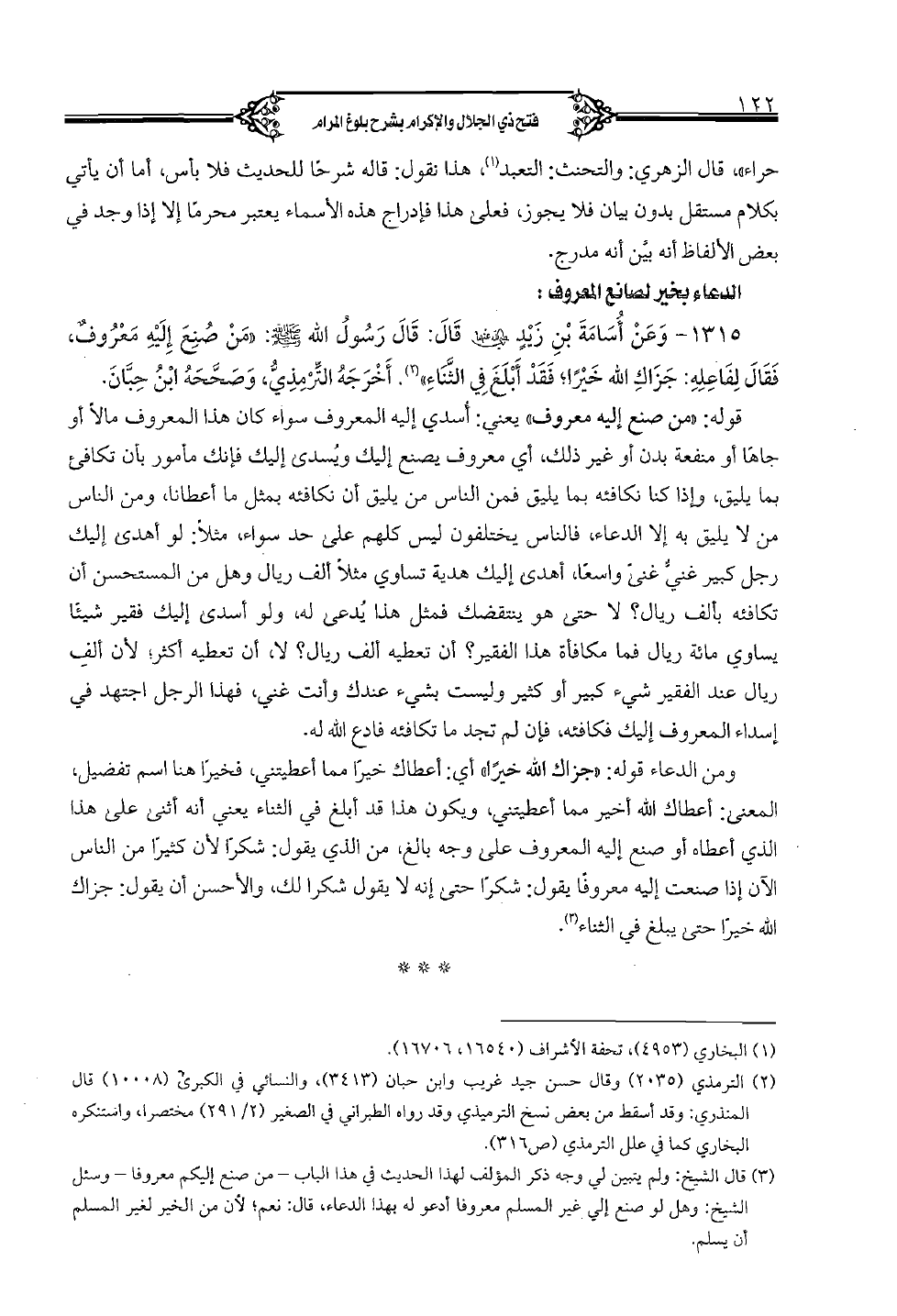 1315 - وعن أسامة بن زيد رضي الله عنها قال: قال رسول الله صلى الله عليه وسلم: "من صنع إليه معروف، فقال لفاعله: جزاك الله خيرًا؛ فقد أبلغ في الثناء". أخرجه الترمذي، وصححه ابن حبان.