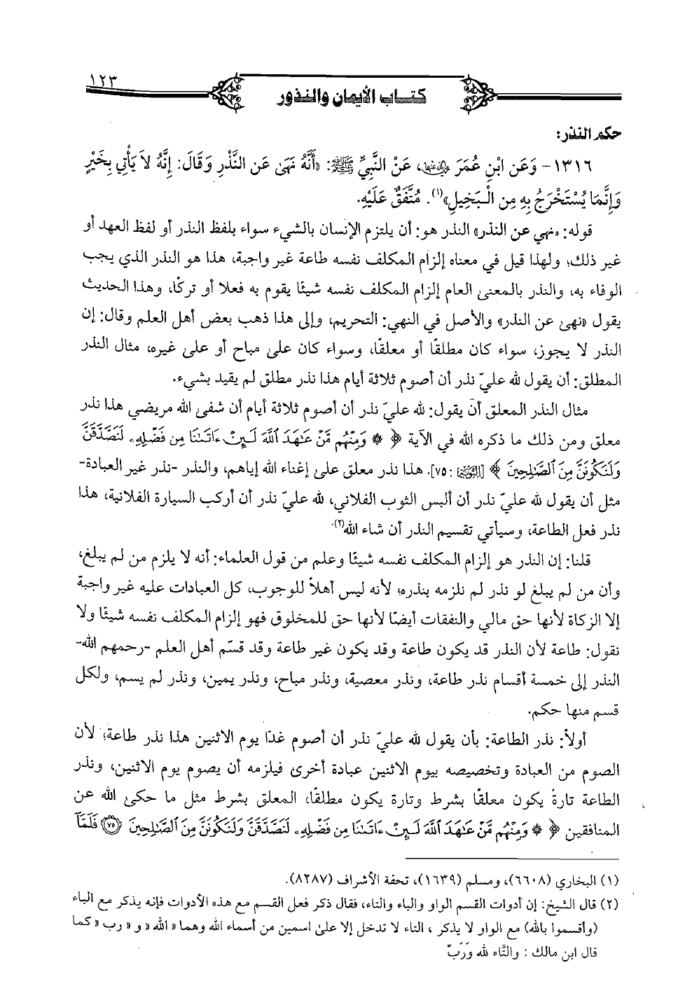 1316 - وعن ابن عمر رضي الله عنها، عن النِّبيِّ صلى الله عليه وسلم: {أنَّه نهى عن النَّذر وقال: إنَّه لا يأتي بخير وإنَّما يستخرج به من البخيل}. متَّفق عليه
