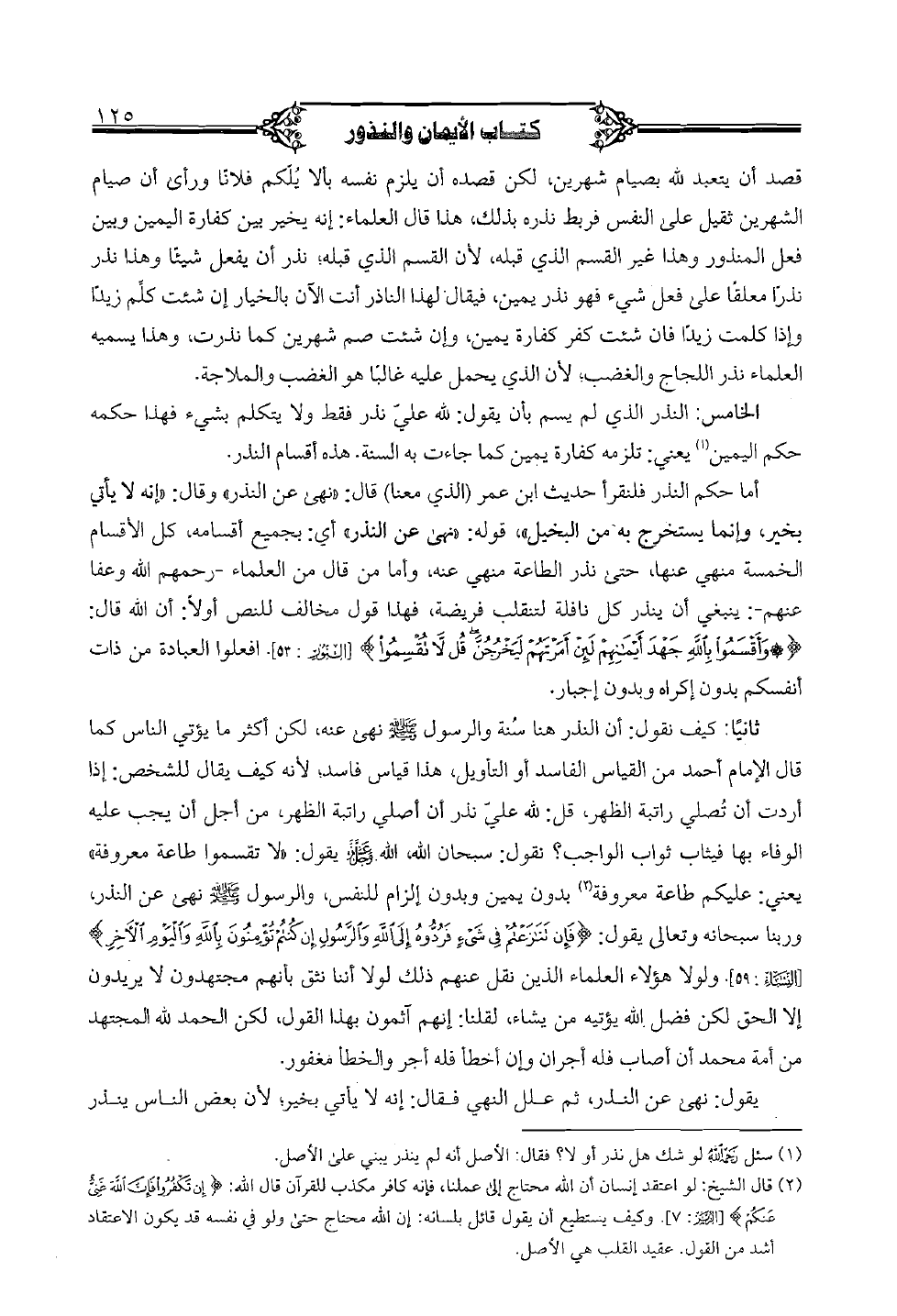 ثانيًا: كيف نقول: أن النذر هنا سنه والرسول صلى الله عليه وسلم نهى عنه، لكن أكثر ما يؤتي الناس كما قال الإمام أحمد من القياس الفاسد أو التأويل، هذا قياس فاسد؛ لأنه كيف يقال للشخص: إذا أردت أن تصلي راتبه الظهر، قل: لله عليّ نذر أن أصلي راتبه الظهر، من أجل أن يجب عليه الوفاء بها فيثاب ثواب الواجب؟ نقول: سبحان الله، الله عز وجل يقول: "لا تقسموا طاعة معروفة" يعني: عليكم طاعة معروفة بدون يمين وبدون إلزام للنفس، والرسول صلى الله عليه وسلم نهى عن النذر، وربنا سبحانه وتعالى يقول: {فإن تنازعتم في شيء فردُّوه إلى الله والرسول إن كنتم تؤمنون بالله واليوم الآخر} [النساء: 59]. ولولا هؤلاء العلماء الذين نقل عنهم ذلك لولا أننا نثق بأنهم مجتهدون لا يريدون إلا الحق لكن فضل الله يؤتيه من يشاء، لقلنا: إنهم آثمون بهذا القول، لكن الحمد لله المجتهد من أمة محمد أن أصاب فله أجران وإن أخطأ فله أجر والخطأ مغفور.