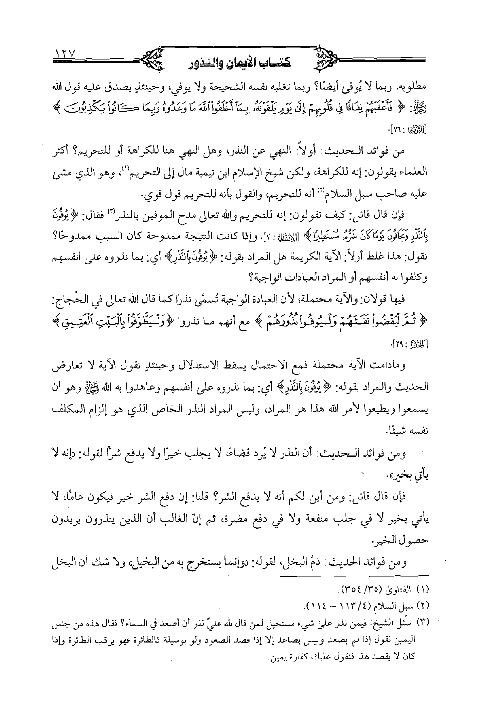 وما دامت الآية محتملة فمع الاحتمال يسقط الاستدلال وحينئذٍ نقول الآية لا تعارض الحديث والمراد بقوله: {يوفون بالنذر} أي: بما نذروه على أنفسه وعاهدوا به الله عز وجل وهو أن يسمعوا ويطيعوا لأمر الله هذا هو المراد، وليس المراد النذر الخاص الذي هو إلزام المكلف نفسه شيئًا.
