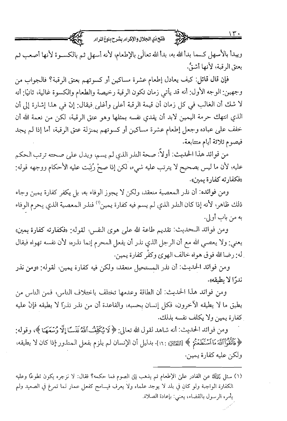 ومن فوائد الحديث: أنه شاهد لقول الله تعالى: {لا يكلف الله نفسًا إلا وسعها}، وقوله: {فاتقوا الله ما استطعتم} [التغابن: 16]. بدليل أن الإنسان لم يلزم بفعل المنذور إذا كان لا يطيقه، ولكن كفارة عليه كفارة يمين.