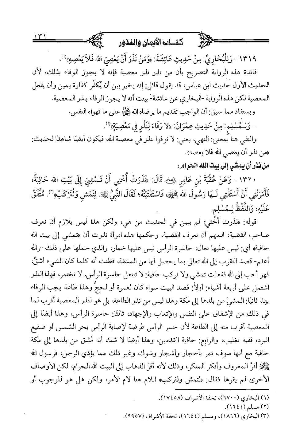 1319 - وللبخاريِّ: من حديث عائشة: "ومن نذر أن يعصي الله فلا يعصه".