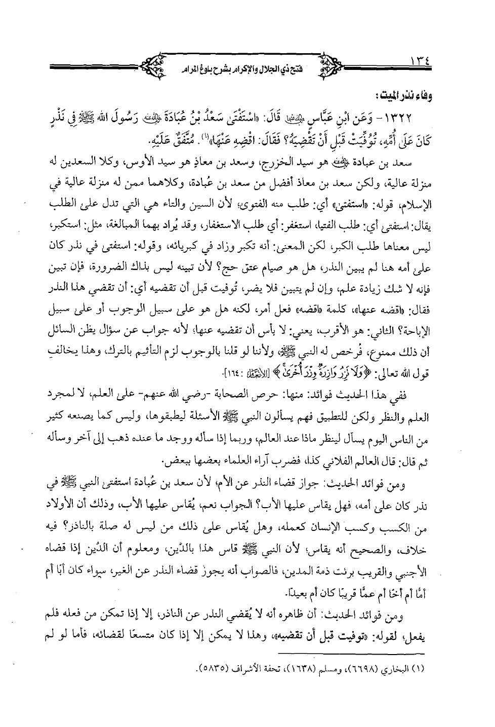 1322 - وعن ابن عبَّاس رضي الله عنهما قال: "استفتي سعد بن عبادة رضي الله عنه رسول الله صلى الله عليه وسلم في نذرٍ كان على أمِّه، توفِّيت قبل أن تقضيه؟ فقال: اقضه عنها". متَّفق عليه.
