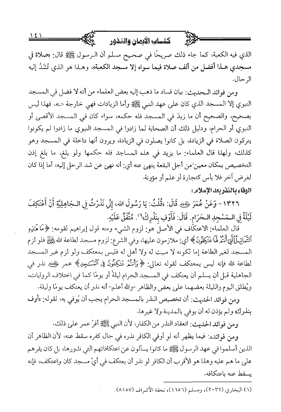 1326 - وعن عمر رضي الله عنه قال: "قلت: يا رسول الله، إنِّي نذرت في الجاهليَّة أن أعتكف ليلةً في المسجد الحرام. قال: فأوف بنذرك". متَّفق عليه.