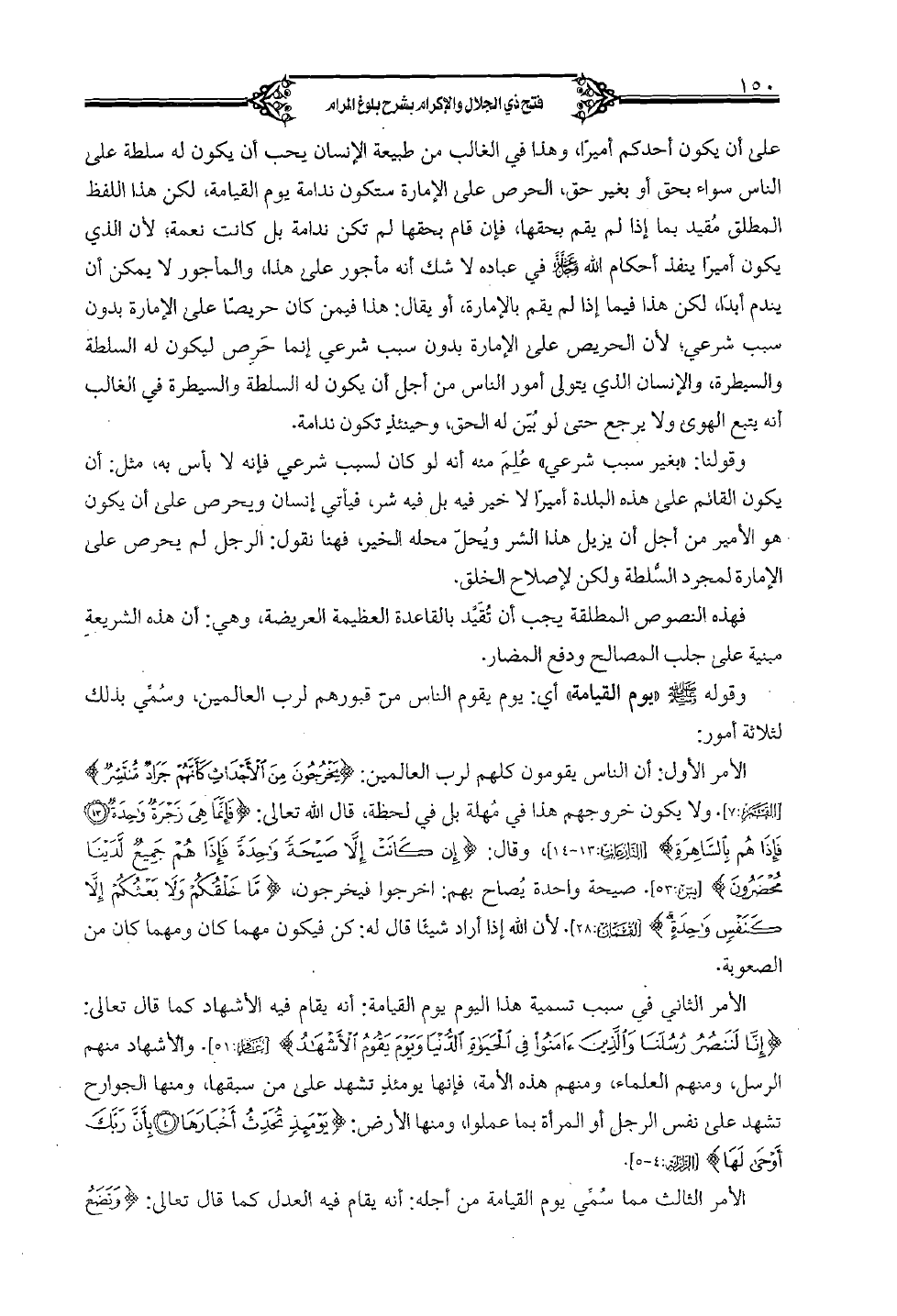 على أن يكون أحدكم أميرًا، وهذا في الغالب من طبيعة الإنسان يحب أن يكون له سلطة على الناس سواء بحق أو بغير حق، الحرص على الإمارة ستكون ندامة يوم القيامة، لكن هذا اللفظ المطلق مقيد بما إذا لم يقم بحقها، فإن قام بحقها لم تكن ندامة بل كانت نعمة؛ لأن الذي يكون أميرًا ينفذ أحكام الله عز وجل في عباده لا شك أنه مأجور على هذا، والمأجور لا يمكن أن يندم أبدًا، لكن هذا فيما إذا لم يقم بالإمارة، أو يقال: هذا فيمن كان حريصًا على الإمارة بدون سبب شرعي؛ لأن الحريص على الإمارة بدون سبب شرعي إنما حرص ليكون له السلطة والسيطرة، والإنسان الذي يتولى أمور الناس من أجل أن يكون له السلطة والسيطرة في الغالب أنه يتبع الهوى ولا يرجع حتى لو بين له الحق، وحينئذ تكون ندامة. وقولنا: "بغير سبب شرعي" علم منه أنه لو كان لسبب شرعي فإنه لا بأس به، مثل: أن يكون القائم على هذه البلدة أميرا لا خير فيه بل فيه شر، فيأتي إنسان ويحرص على أن يكون هو الأمير من أجل أن يزيل هذا الشر ويحلّ محله الخير، فهنا نقول: الرجل لم يحرص على الإمارة لمجرد السُّلطة ولكن لإصلاح الخلق.