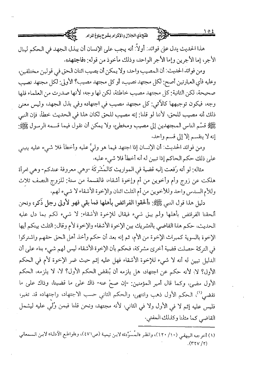 دليل هذا قول النبي صلى الله عليه وسلم: «ألحقوا الفرائض بأهلها فما بقي فهو لأولى رجل ذكر» ونحن ألحقنا الفرائض بأهلها ولم يبق شيء فيقال للإخوة الأشقاء: لا شيء لكم بما دل عليه الحديث، حكم هذا القاضي بالتشريك بين الأخوة الأشقاء والإخوة لأم وقال: الثلث بينكم أيها الإخوة بالسوية كميراث الإخوة من الأم، ثم إنه بعد أن حكم وأخذ أهل الحق حقهم واشتركوا في التركة حصلت قضية أخرى مشركة، فحكم بان الإخوة الأشقاء ليس له شيء بناء على أن الدليل تبين له أنه لا شيء للإخوة الأشقاء فهل عليه إثم حيث ضر الإخوة لأم في الحكم الأول؟ لا؛ لأنه حكم عن اجتهاد، هل يلزمه أن ينقض الحكم الأول؟ لا، لا يلزمه، الحكم الأول مضى، وكما قال أمير المؤمنين: -إن صح عنه- ذاك على ما قضينا، وذاك على ما نقضي، الحكم الأول ذهب وانتهى، والحكم الثاني حسب الاجتهاد، واجتهاده قد تغير، فليس عليه إثم لا في الأول ولا في الثاني؛ لأنه مجتهد، ونحن قلنا فيمن ولي عليه ليشمل القاضي كما مثلنا وكذلك المفتي.