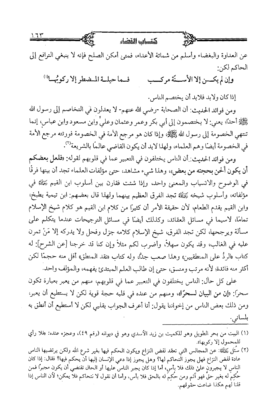 ومن فوائد الحديث: أن الناس يختلفون في التعبير عما في قلوبهم لقوله: "فلعل بعضكم أن يكون ألحن بحجته من بعض"، وهذا شيء مشاهد، حتى مؤلفات العلماء تجد أن بينها فرقاً في الوضوح والانسياب والمعنى واحد، وإذا شئت فقارن بين أسلوب ابن القيم رحمه الله في مؤلفاته، وأسلوب شيخه رحمه الله تجد الفرق العظيم بينهما ولهذا قال بعضهم: ابن تيمية يطبخ، وابن القيم يقدم الطعام؛ لأن حقيقة الأمر أن كثيراً من كلام ابن القيم هو كلام شيخ الإسلام تماماً، لاسيما في مسائل العقائد، وكذلك أيضاً في مسائل الترجيحات عندما يتكلم على مسألة ويرجحها، لكن تجد الفرق، شيخ الإسلام كلامه جزل وفحل ولا يدركه إلا من تمرن عليه في الغالب، وقد يكون سهلاً، وأضرب لكم مثلا وإن كنا قد خرجنا [عن الشرح]: له كتاب "الرد على المنطقيين" وهذا صعب جدا، وله كتاب "نقد المنطق" أقل منه حجماً لكن أكثر منه فائدة؛ لأنه مرتب ومنسق، حتى إن طالب العلم المبتدئ يفهمه، والمؤلف واحد.