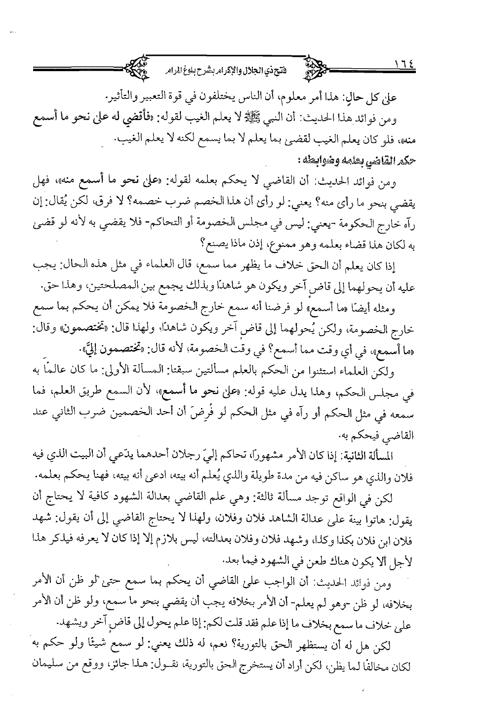 ومن فوائد هذا الحديث: أن النبي صلى الله عليه وسلم لا يعلم الغيب لقوله: «فأقضي له على نحو ما أسمع منه»، فلو كان يعل م الغيب لقضى بما يعلم لا بما يسمع لكنه لا يعلم الغيب.
