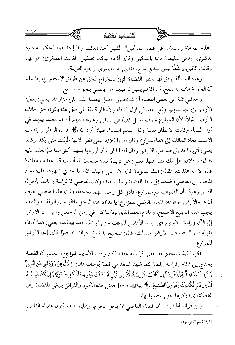 انظروا كيف استدرجه حتى أقر بأنه عقد، لكن زادت الأسهم فتراجع، المهم أن القضاء يحتاج إلى ذكاء وفراسة وفطنة كما شهد شاهد في قضية يوسف قال: {قال هي راودتني عن نفسي وشهد شاهد من أهلها إن كان قميصه قد من قبل فصدقت وهو من الكاذبين وإن كان قميصه قد من دبر فكذبت وهو من الصادقين} [يوسف: 26 - 27]. فمثل هذه الأمور والقرائن ينبغي للقضاة وغير القضاة أن يدركوها حتى ينتفعوا بها.